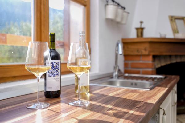 Dvě odlehlé chaty na vinici s výhledem na moře a Pitve