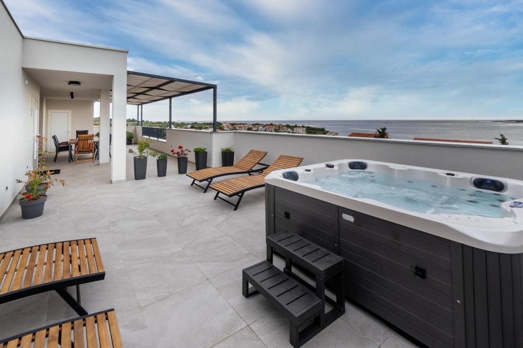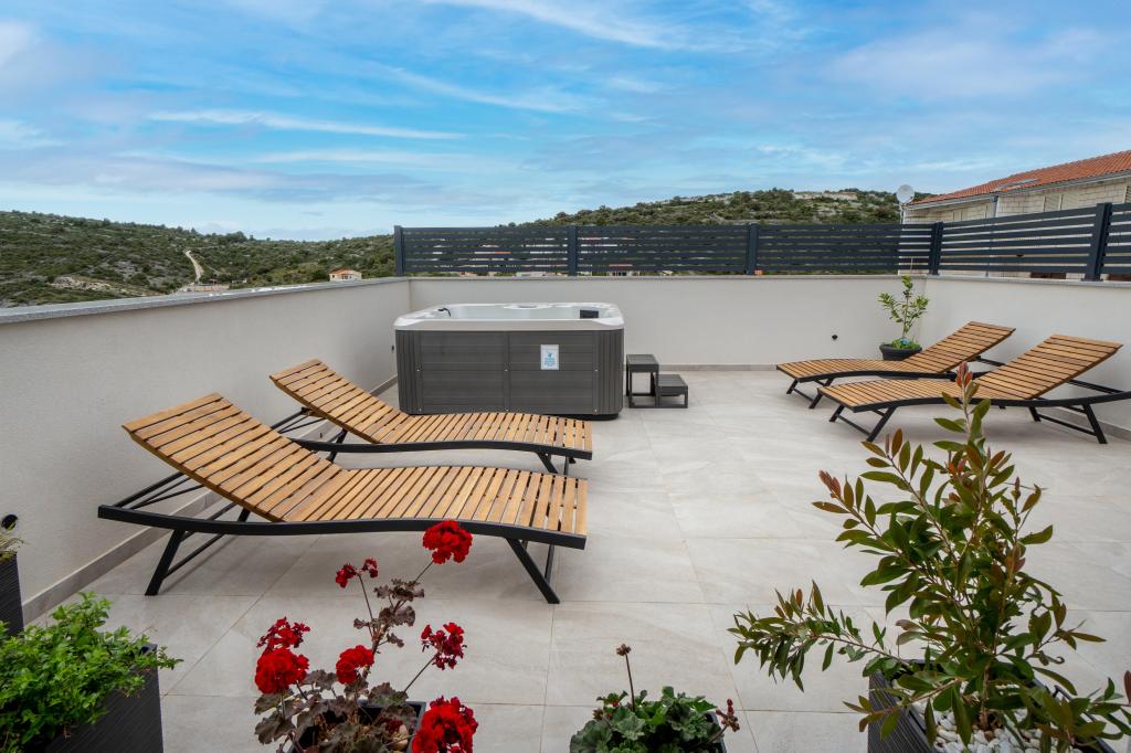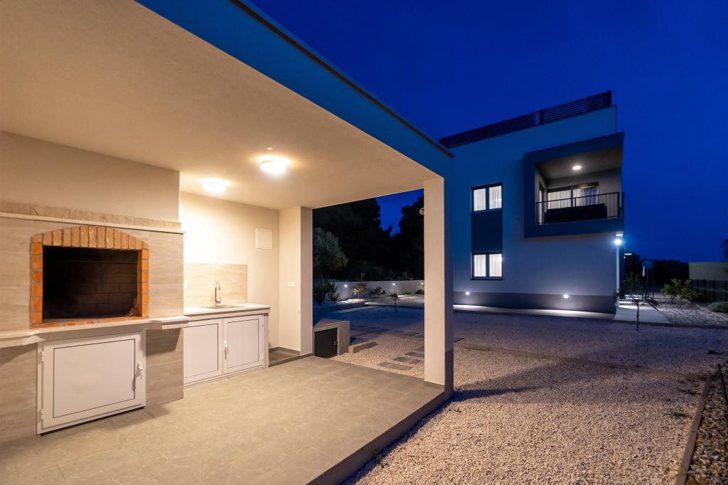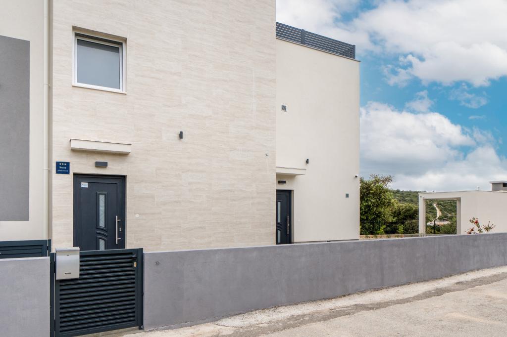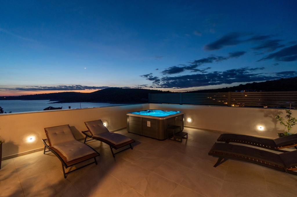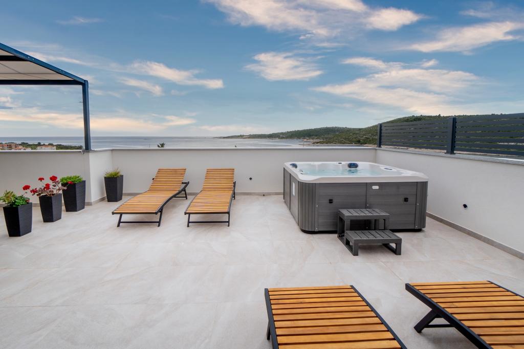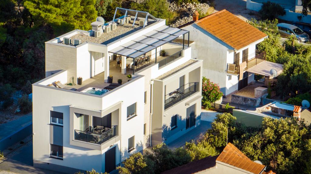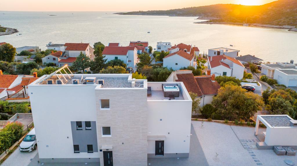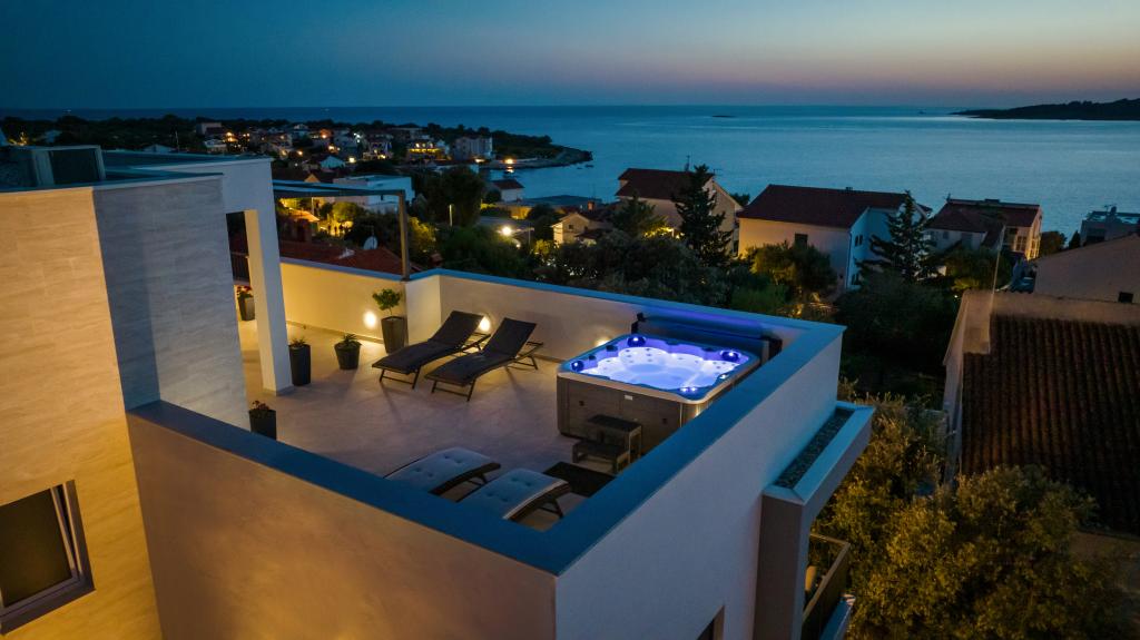 Nové zařízení. Užijte si se svou rodinou v tomto moderním ubytování s krásnými západy slunce a výhledem na moře. Klidná čtvrť. Dva byty, které se pronajímají jako celek. V přízemí se nachází studio sestávající z kuchyně, koupelny a pokoje s manželskou postelí, v obývacím pokoji je také přistýlka. V prvním patře je velký apartmán sestávající z kuchyně, obývacího pokoje, balkonu se zahradním nábytkem ideální pro ranní kávu, dvou pokojů s manželskou postelí a jednoho pokoje se dvěma samostatnými lůžky, které lze v případě potřeby propojit. Tento byt má dvě koupelny, z nichž jedna je součástí pokoje a jedno WC. Ve druhém patře budovy je velká terasa s výhledem do celého areálu a hydromasážní vana pro 5 osob, lehátka na slunění, gril, letní kuchyně a stůl a židle. Venku je také menší zastřešené zázemí s grilem a stolem a lavicemi.