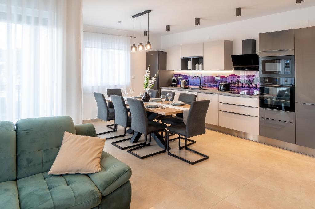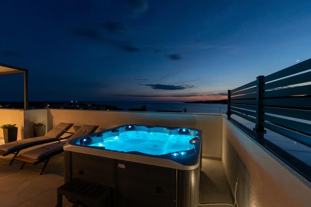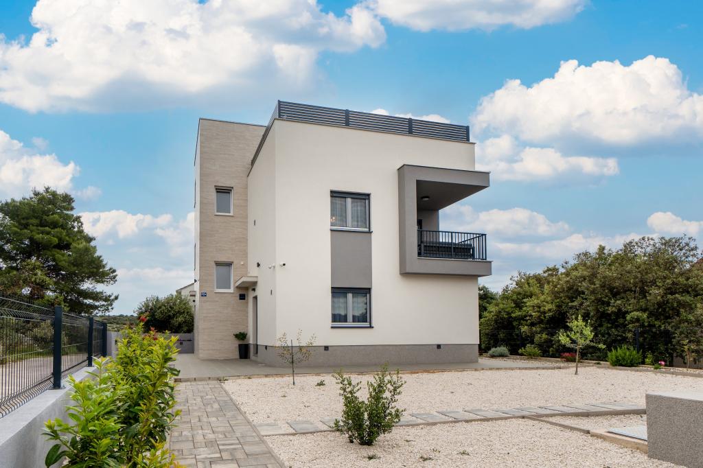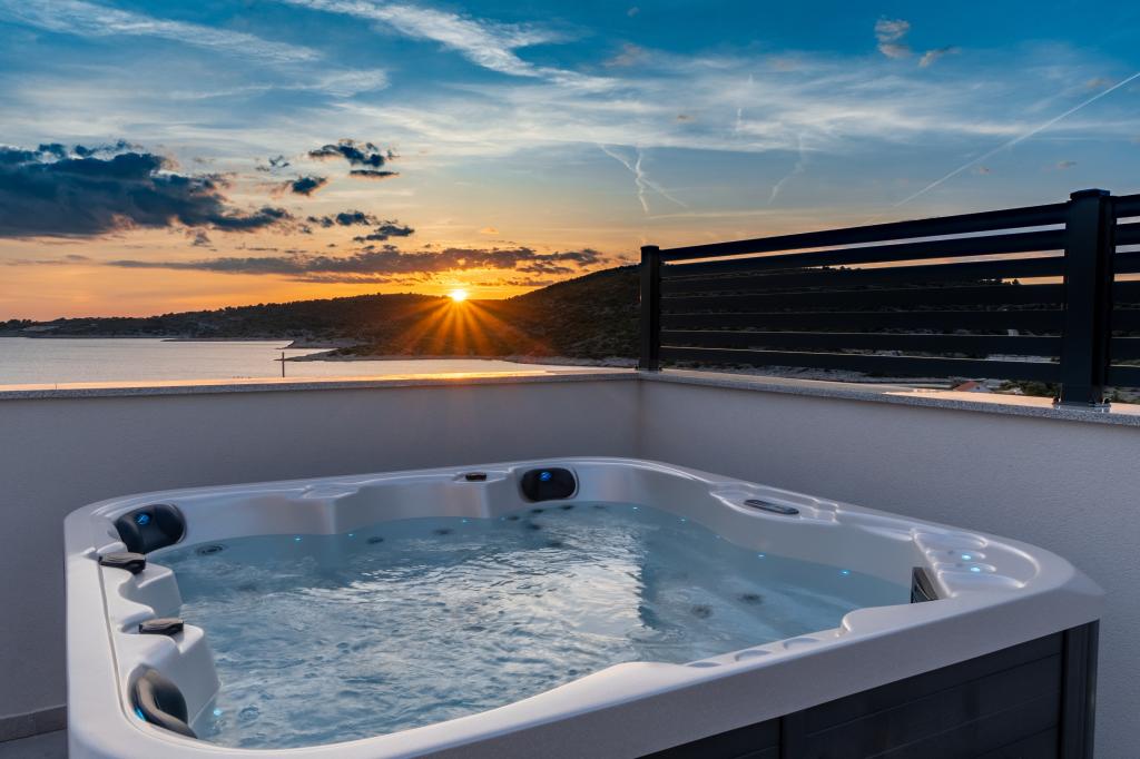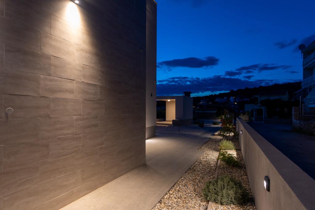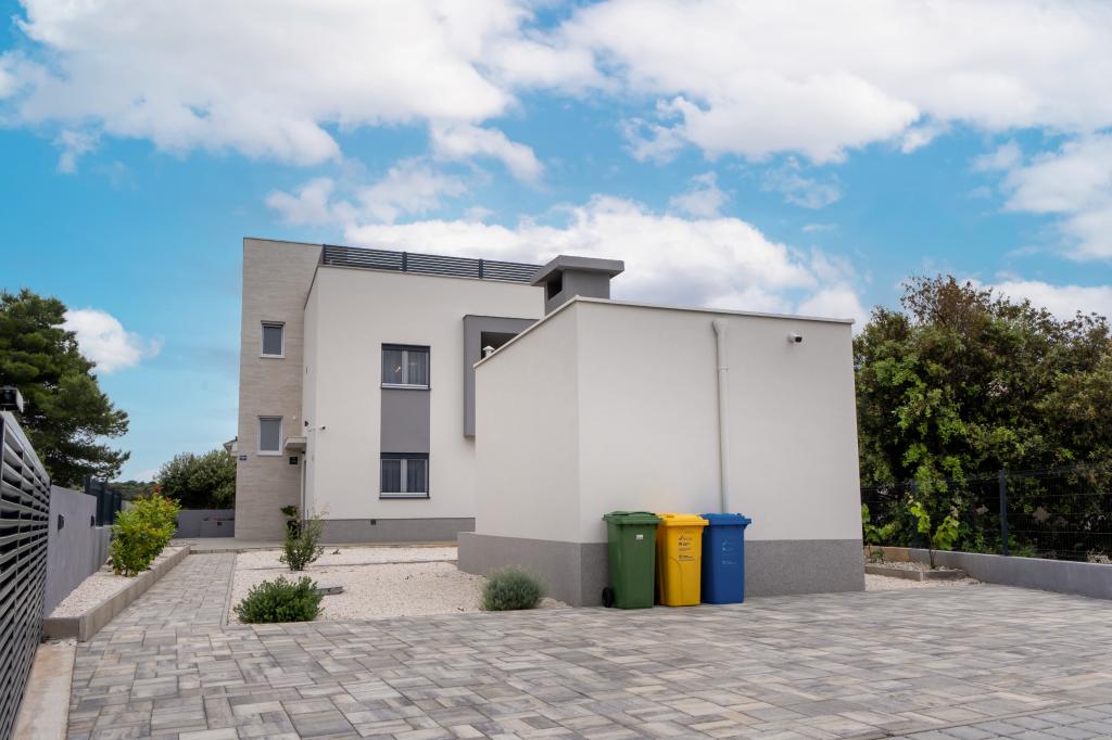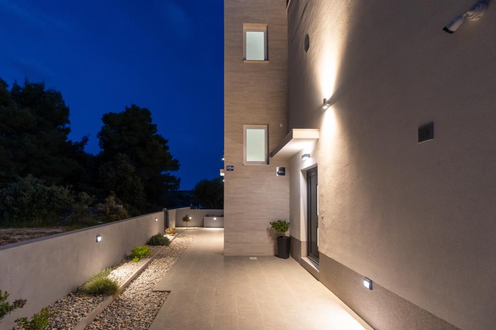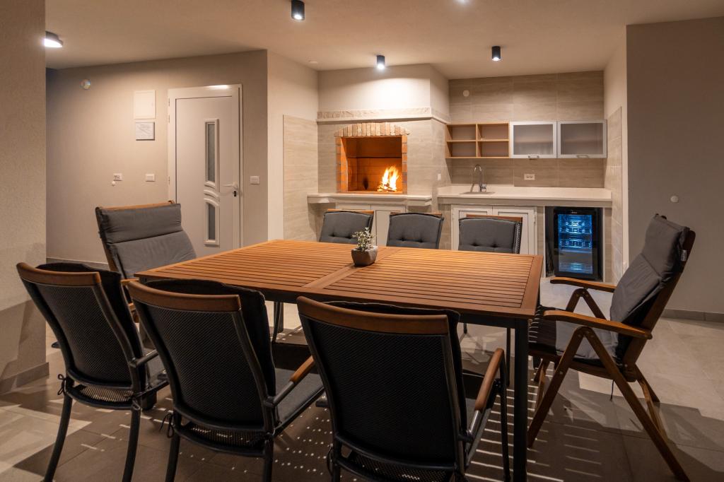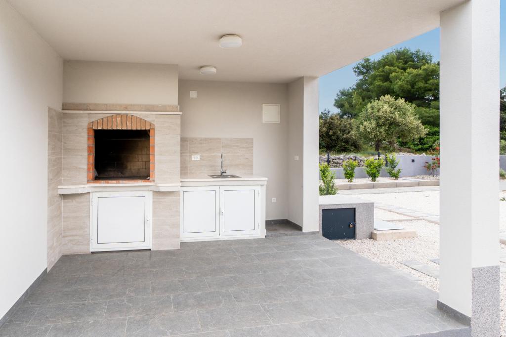 Nové zařízení. Užijte si se svou rodinou v tomto moderním ubytování s krásnými západy slunce a výhledem na moře. Klidná čtvrť. Dva byty, které se pronajímají jako celek. V přízemí se nachází studio sestávající z kuchyně, koupelny a pokoje s manželskou postelí, v obývacím pokoji je také přistýlka. V prvním patře je velký apartmán sestávající z kuchyně, obývacího pokoje, balkonu se zahradním nábytkem ideální pro ranní kávu, dvou pokojů s manželskou postelí a jednoho pokoje se dvěma samostatnými lůžky, které lze v případě potřeby propojit. Tento byt má dvě koupelny, z nichž jedna je součástí pokoje a jedno WC. Ve druhém patře budovy je velká terasa s výhledem do celého areálu a hydromasážní vana pro 5 osob, lehátka na slunění, gril, letní kuchyně a stůl a židle. Venku je také menší zastřešené zázemí s grilem a stolem a lavicemi.