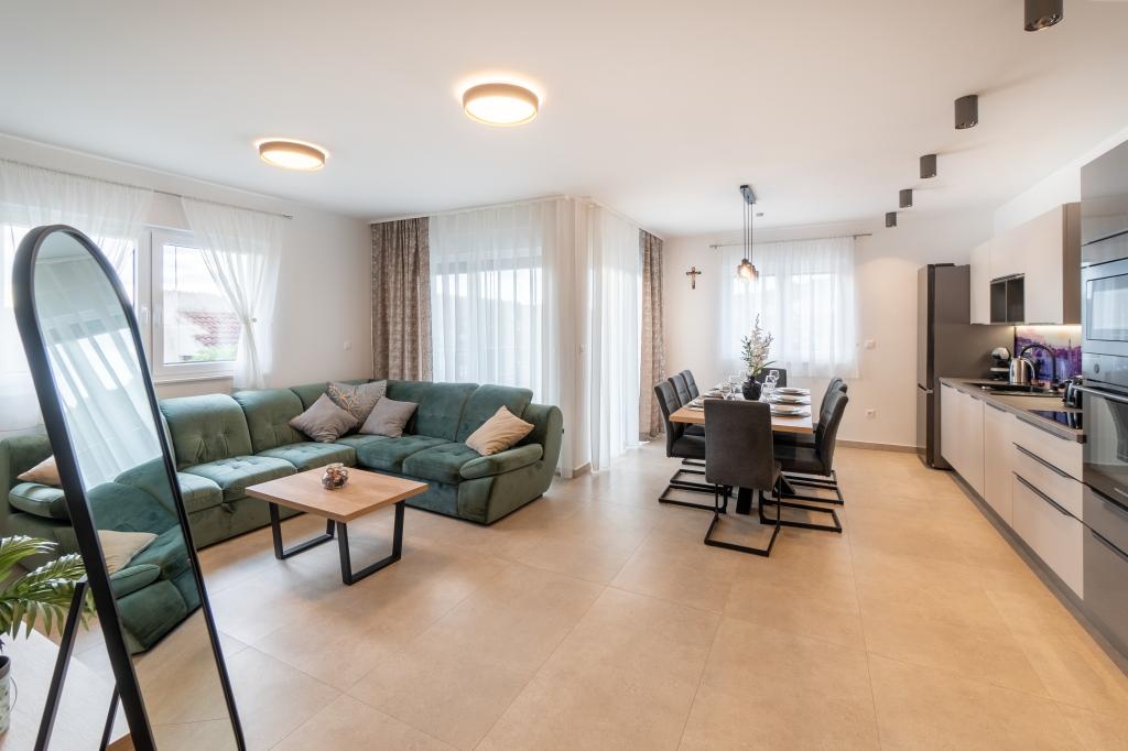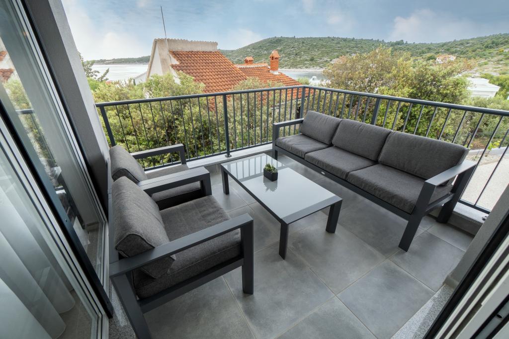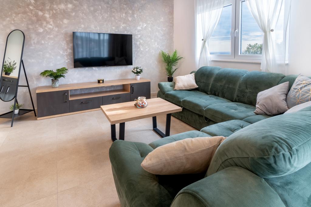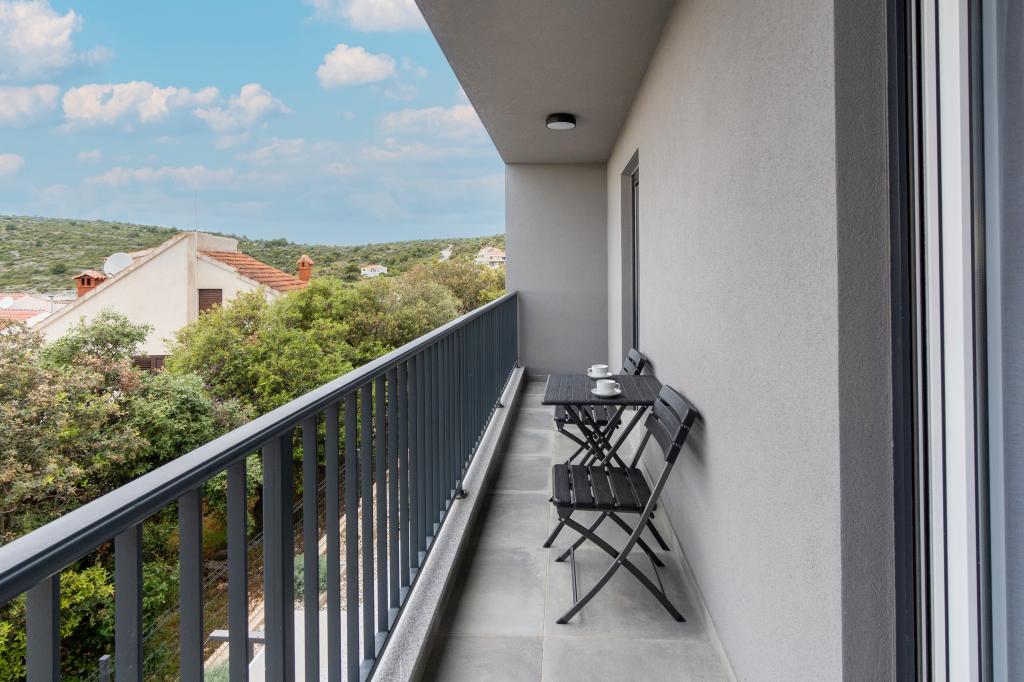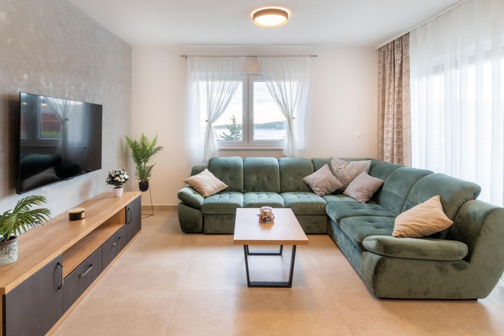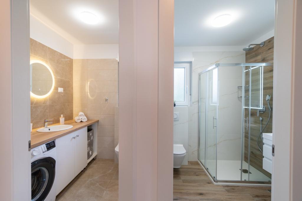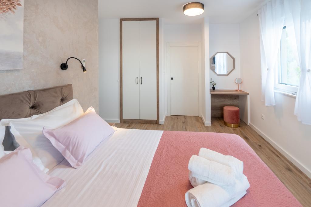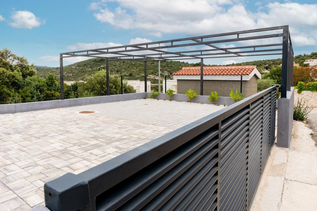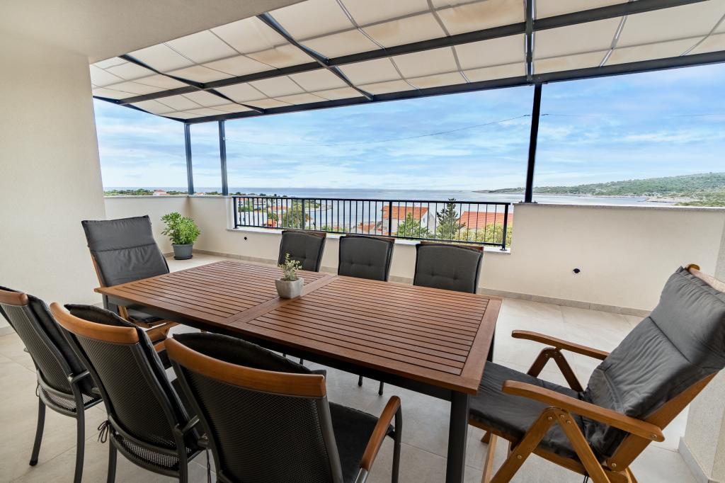 Nové zařízení. Užijte si se svou rodinou v tomto moderním ubytování s krásnými západy slunce a výhledem na moře. Klidná čtvrť. Dva byty, které se pronajímají jako celek. V přízemí se nachází studio sestávající z kuchyně, koupelny a pokoje s manželskou postelí, v obývacím pokoji je také přistýlka. V prvním patře je velký apartmán sestávající z kuchyně, obývacího pokoje, balkonu se zahradním nábytkem ideální pro ranní kávu, dvou pokojů s manželskou postelí a jednoho pokoje se dvěma samostatnými lůžky, které lze v případě potřeby propojit. Tento byt má dvě koupelny, z nichž jedna je součástí pokoje a jedno WC. Ve druhém patře budovy je velká terasa s výhledem do celého areálu a hydromasážní vana pro 5 osob, lehátka na slunění, gril, letní kuchyně a stůl a židle. Venku je také menší zastřešené zázemí s grilem a stolem a lavicemi.
