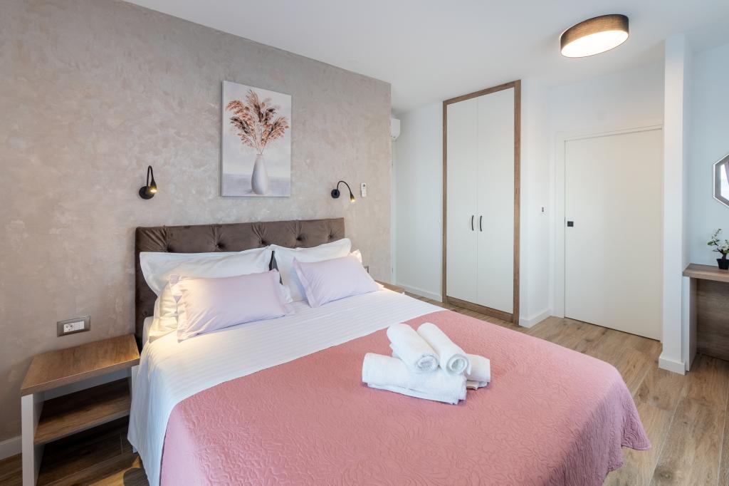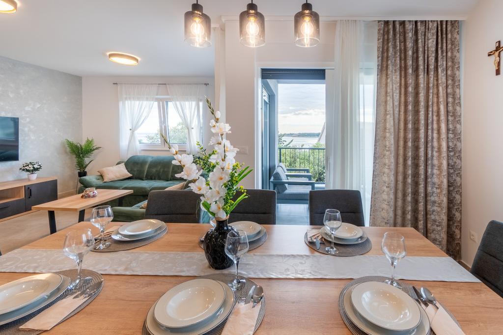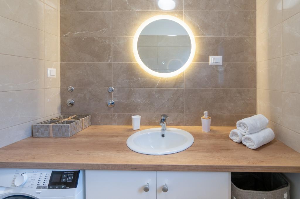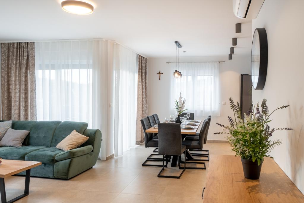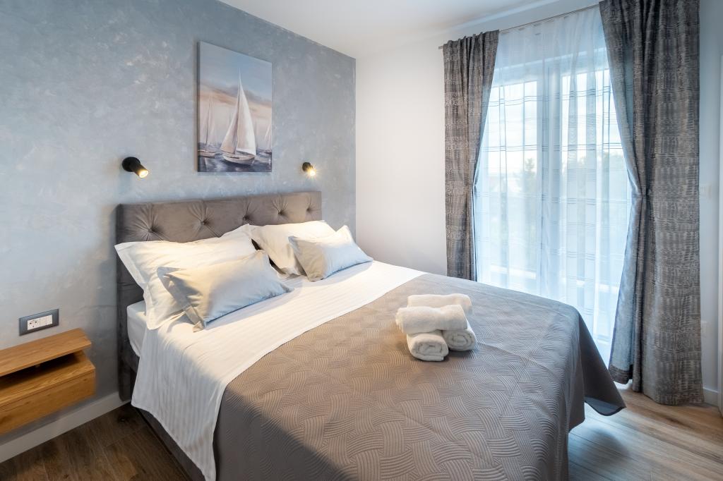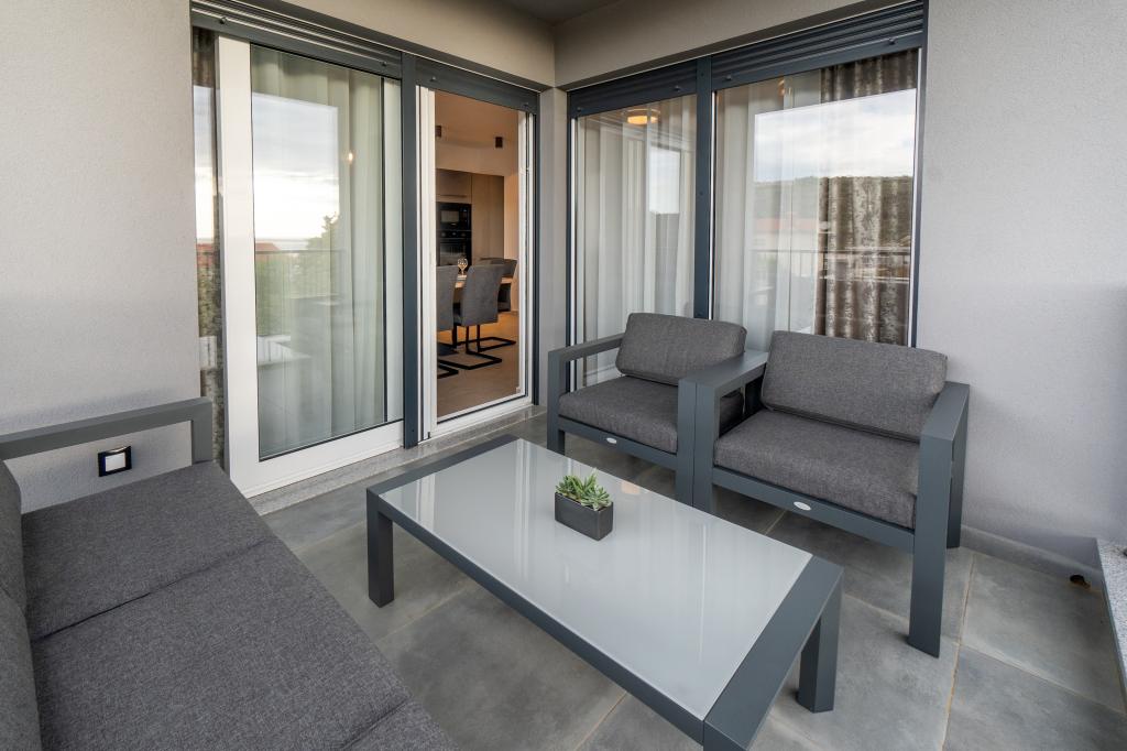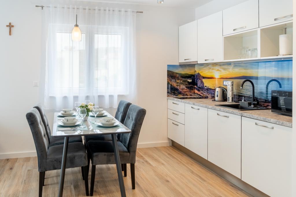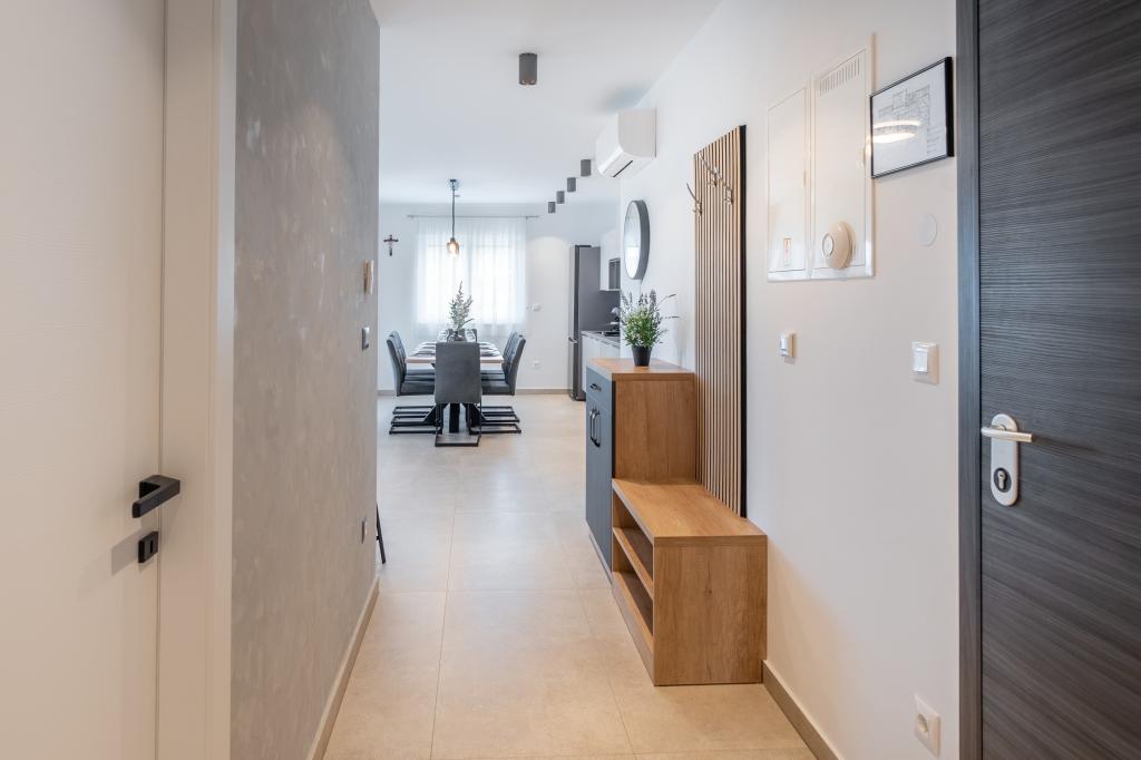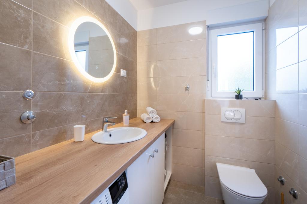 Nové zařízení. Užijte si se svou rodinou v tomto moderním ubytování s krásnými západy slunce a výhledem na moře. Klidná čtvrť. Dva byty, které se pronajímají jako celek. V přízemí se nachází studio sestávající z kuchyně, koupelny a pokoje s manželskou postelí, v obývacím pokoji je také přistýlka. V prvním patře je velký apartmán sestávající z kuchyně, obývacího pokoje, balkonu se zahradním nábytkem ideální pro ranní kávu, dvou pokojů s manželskou postelí a jednoho pokoje se dvěma samostatnými lůžky, které lze v případě potřeby propojit. Tento byt má dvě koupelny, z nichž jedna je součástí pokoje a jedno WC. Ve druhém patře budovy je velká terasa s výhledem do celého areálu a hydromasážní vana pro 5 osob, lehátka na slunění, gril, letní kuchyně a stůl a židle. Venku je také menší zastřešené zázemí s grilem a stolem a lavicemi.
