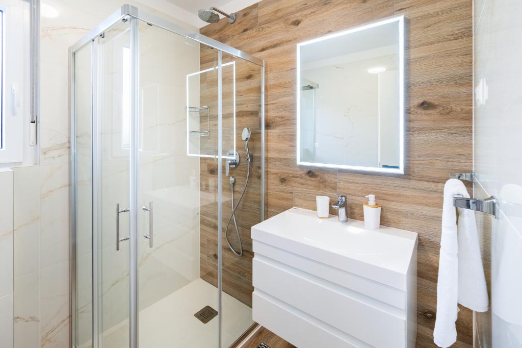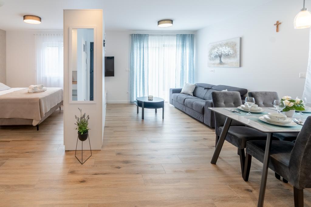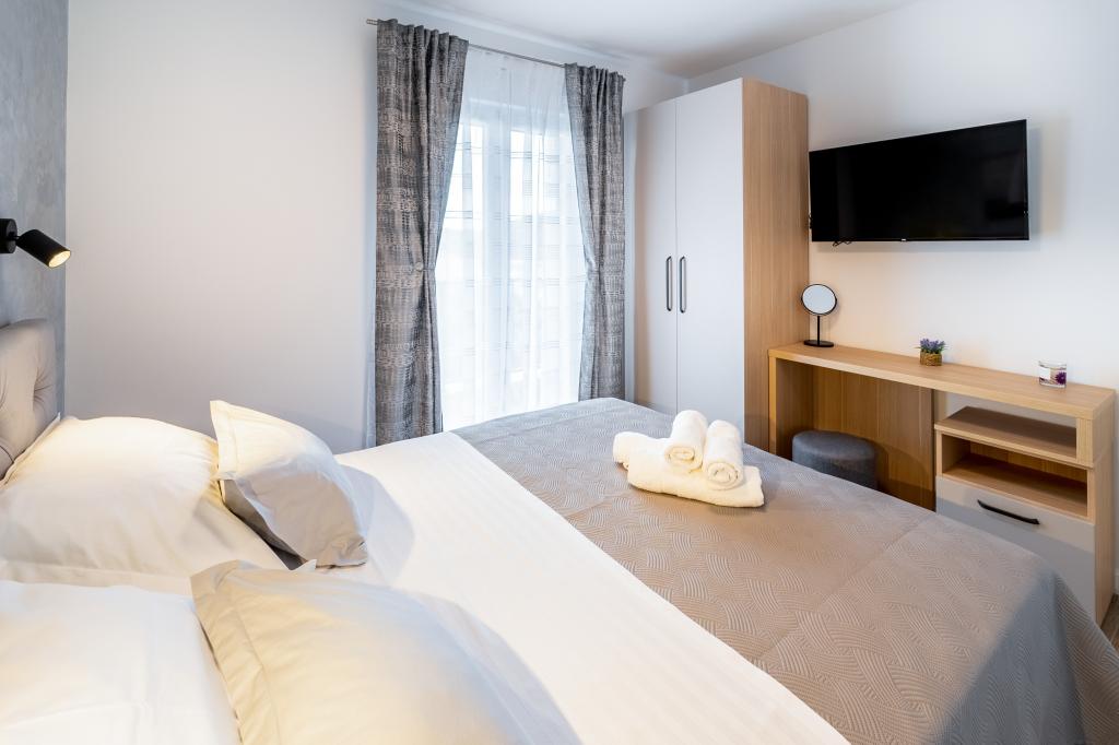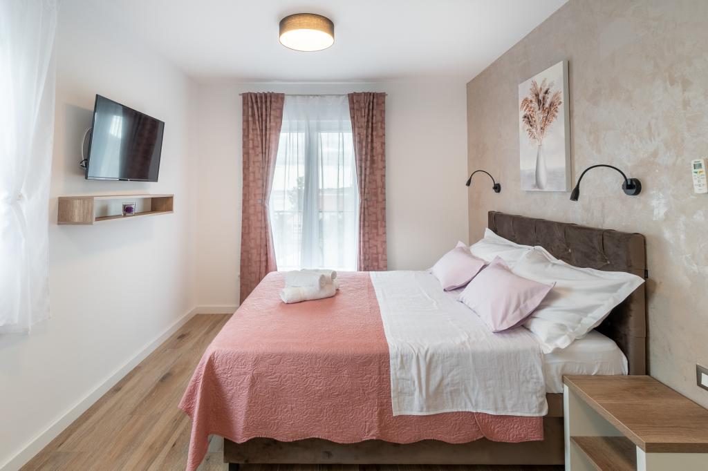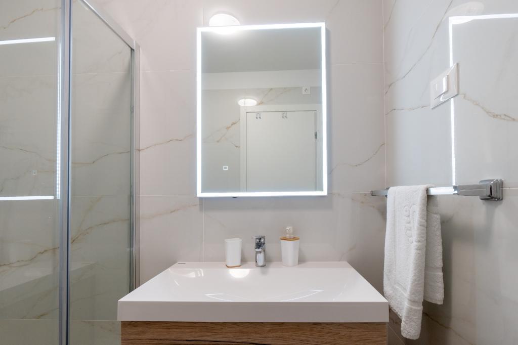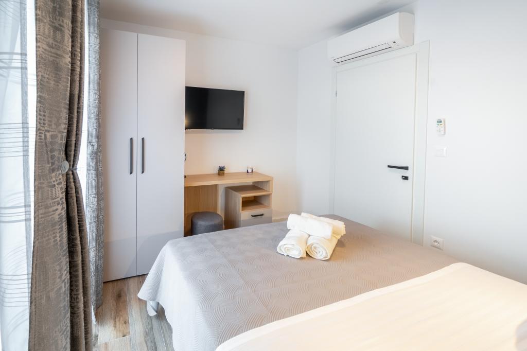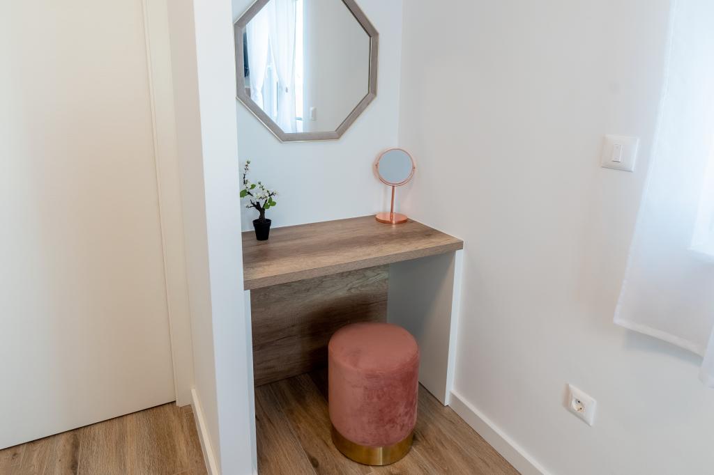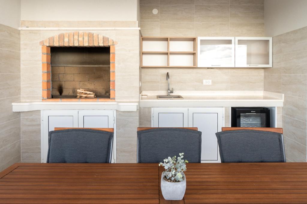 Nové zařízení. Užijte si se svou rodinou v tomto moderním ubytování s krásnými západy slunce a výhledem na moře. Klidná čtvrť. Dva byty, které se pronajímají jako celek. V přízemí se nachází studio sestávající z kuchyně, koupelny a pokoje s manželskou postelí, v obývacím pokoji je také přistýlka. V prvním patře je velký apartmán sestávající z kuchyně, obývacího pokoje, balkonu se zahradním nábytkem ideální pro ranní kávu, dvou pokojů s manželskou postelí a jednoho pokoje se dvěma samostatnými lůžky, které lze v případě potřeby propojit. Tento byt má dvě koupelny, z nichž jedna je součástí pokoje a jedno WC. Ve druhém patře budovy je velká terasa s výhledem do celého areálu a hydromasážní vana pro 5 osob, lehátka na slunění, gril, letní kuchyně a stůl a židle. Venku je také menší zastřešené zázemí s grilem a stolem a lavicemi.