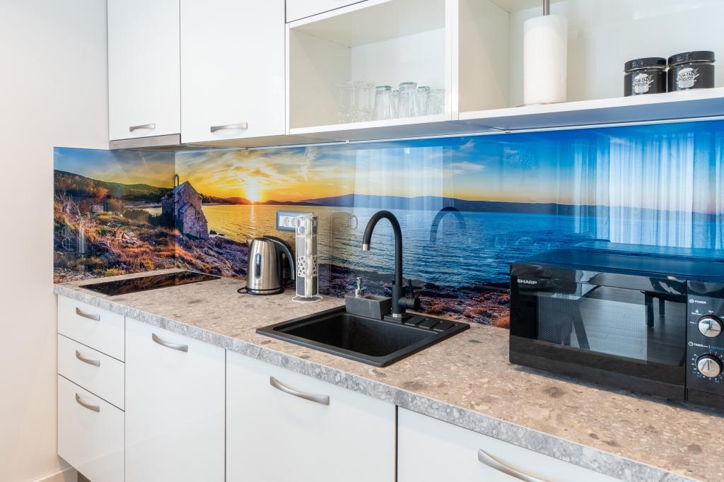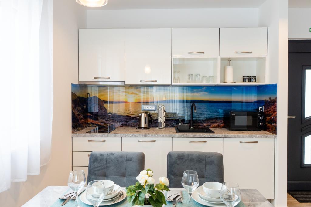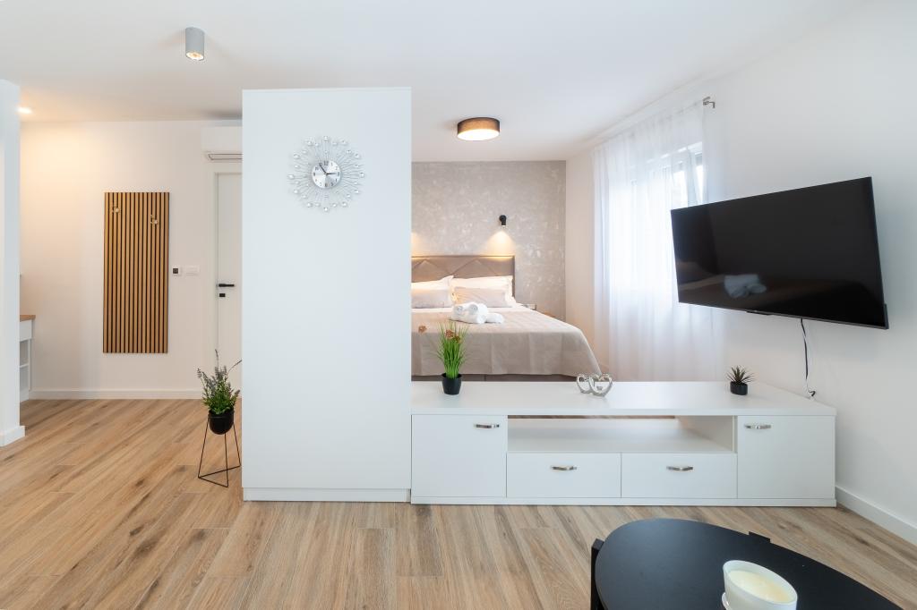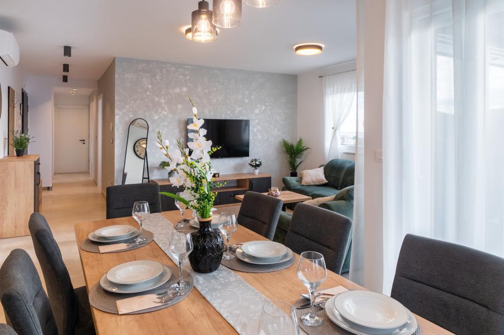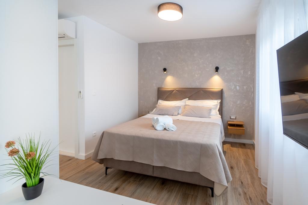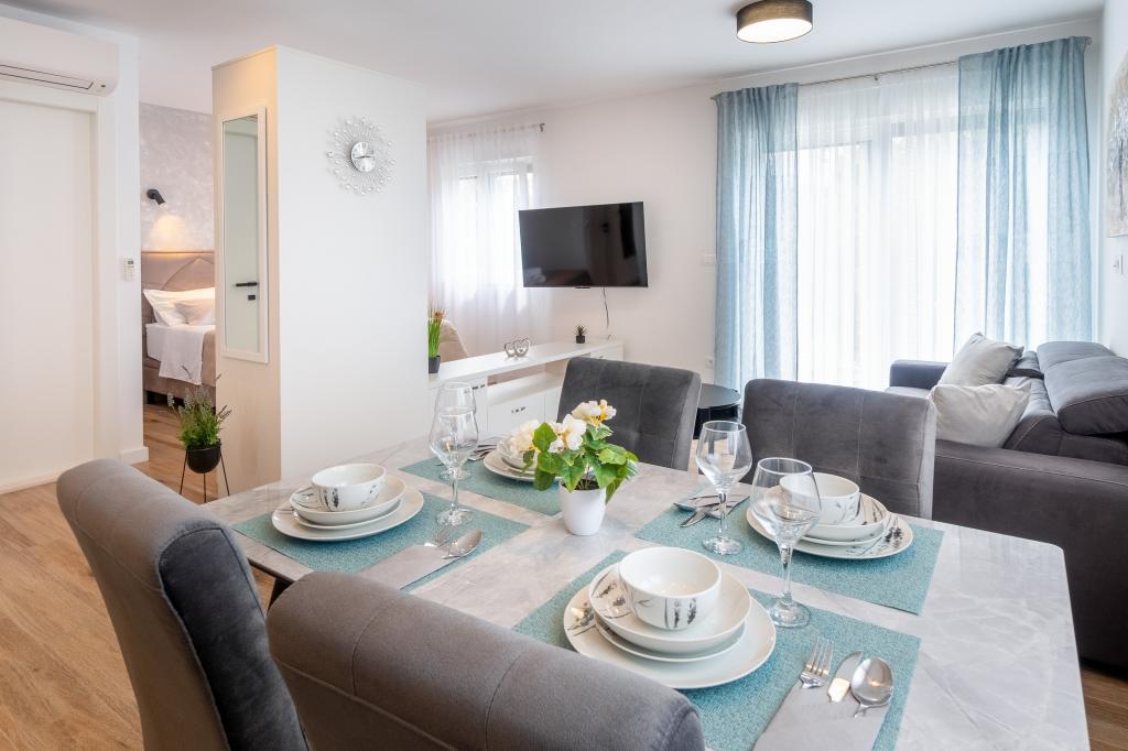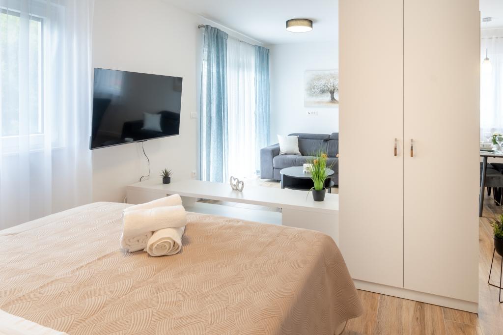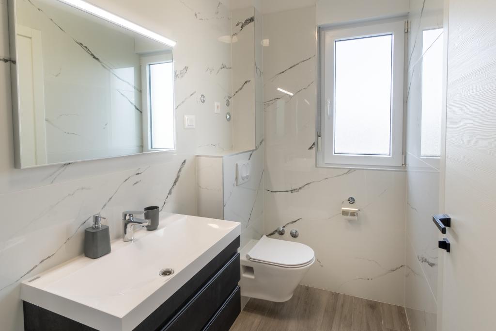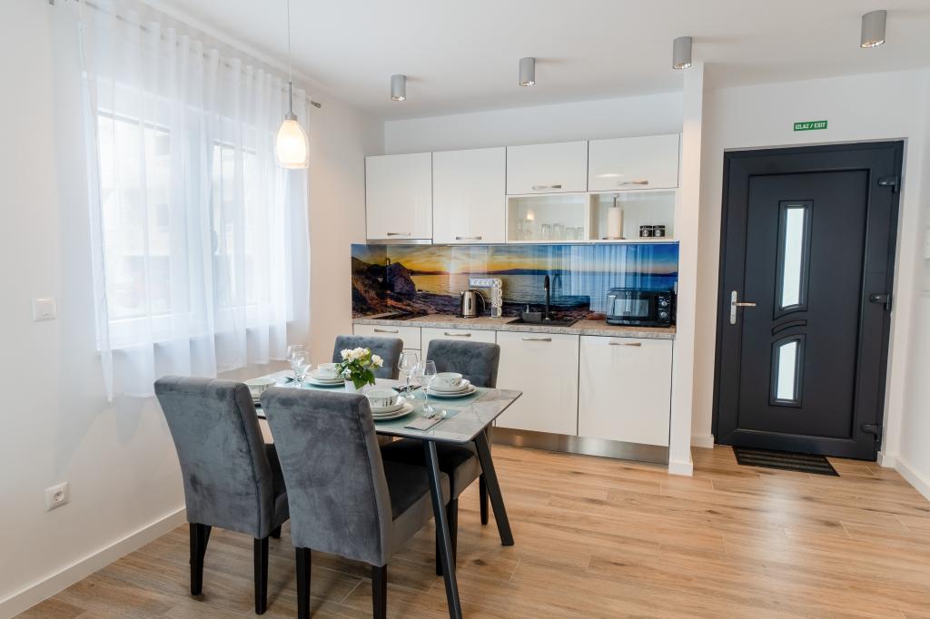Nové zařízení. Užijte si se svou rodinou v tomto moderním ubytování s krásnými západy slunce a výhledem na moře. Klidná čtvrť. Dva byty, které se pronajímají jako celek. V přízemí se nachází studio sestávající z kuchyně, koupelny a pokoje s manželskou postelí, v obývacím pokoji je také přistýlka. V prvním patře je velký apartmán sestávající z kuchyně, obývacího pokoje, balkonu se zahradním nábytkem ideální pro ranní kávu, dvou pokojů s manželskou postelí a jednoho pokoje se dvěma samostatnými lůžky, které lze v případě potřeby propojit. Tento byt má dvě koupelny, z nichž jedna je součástí pokoje a jedno WC. Ve druhém patře budovy je velká terasa s výhledem do celého areálu a hydromasážní vana pro 5 osob, lehátka na slunění, gril, letní kuchyně a stůl a židle. Venku je také menší zastřešené zázemí s grilem a stolem a lavicemi.