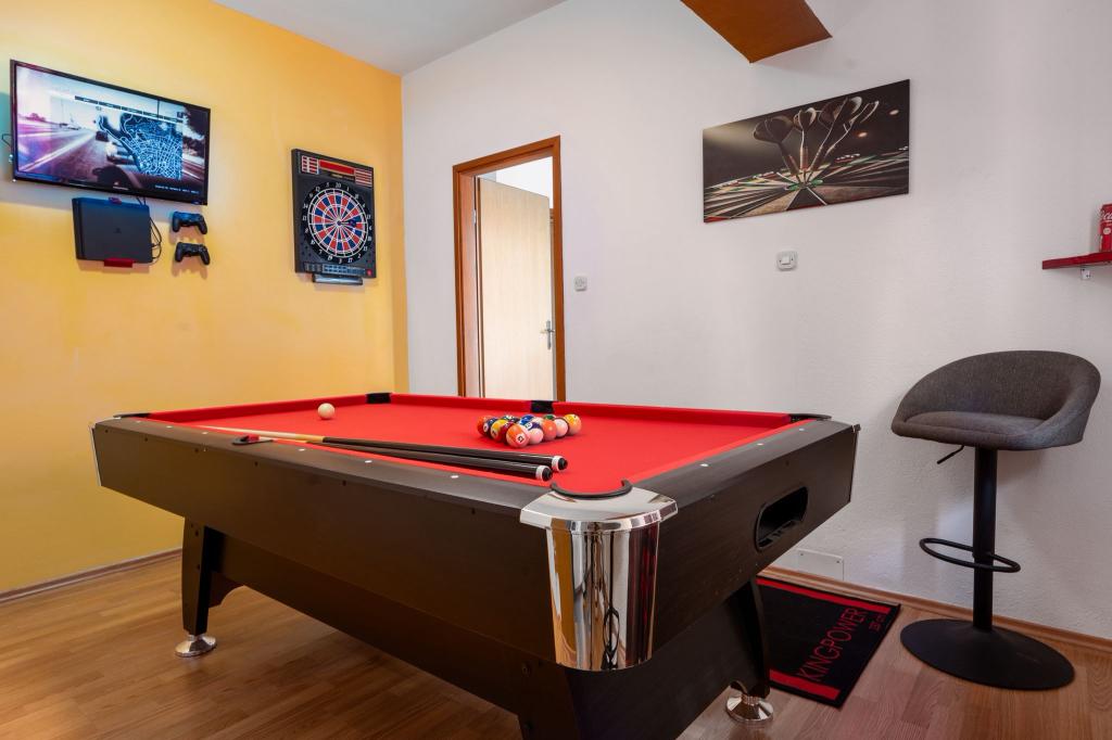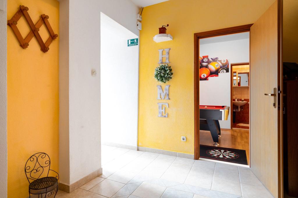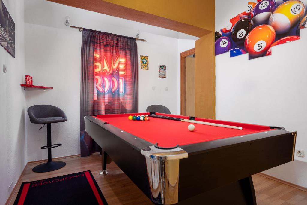 Tento rekreační dům, který nabízí celkem 350 metrů čtverečních užitné plochy, je ideální pro vaši vysněnou dovolenou, zejména pokud cestujete s dětmi. Snažili jsme se, aby si dospělí i děti našli co užít a naplno si užili svou každoroční dovolenou v relaxaci. Kromě toho, že v domě nabízíme hernu s kulečníkem, šipkami a PlayStationem, jsou ve venkovním prostoru také houpačky a skluzavka pro děti a pokud by to nestačilo, je zde hřiště, kde si můžete zahrát basketbal nebo fotbal, pouhých 50 metrů od budovy. Tento rekreační dům nabízí také venkovní ohniště pro večerní posezení a odpočinek u bazénu. Pokud přijíždíte s přáteli nebo příbuznými, zajistili jsme také samostatné kuchyně, pokoje a koupelny. Makarská je vzdálená 2 km a nabízí také jednodenní výlety na ostrovy Hvar, Brač a Korčula. Dům se nachází na klidném místě s výhledem na celou Makarskou.