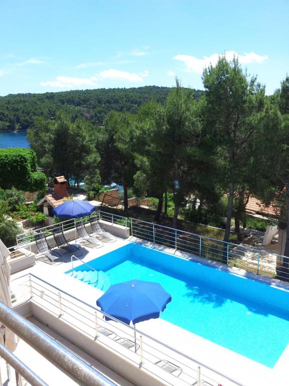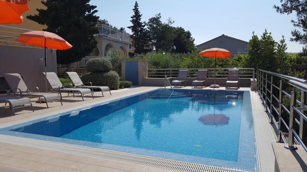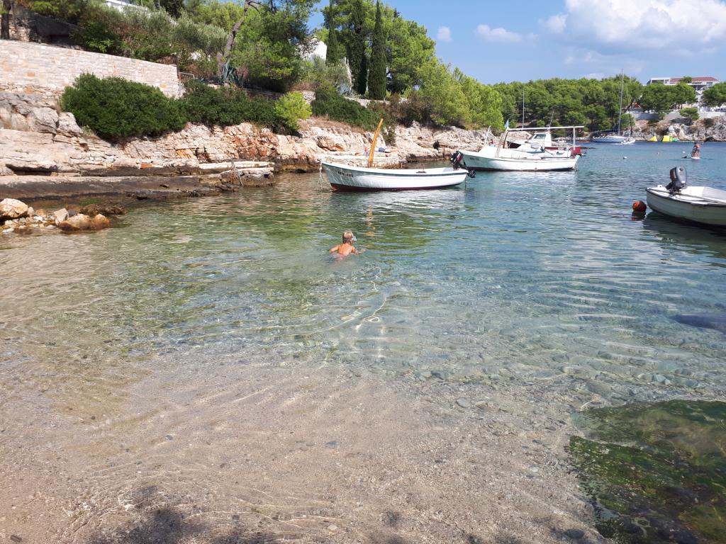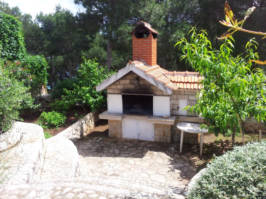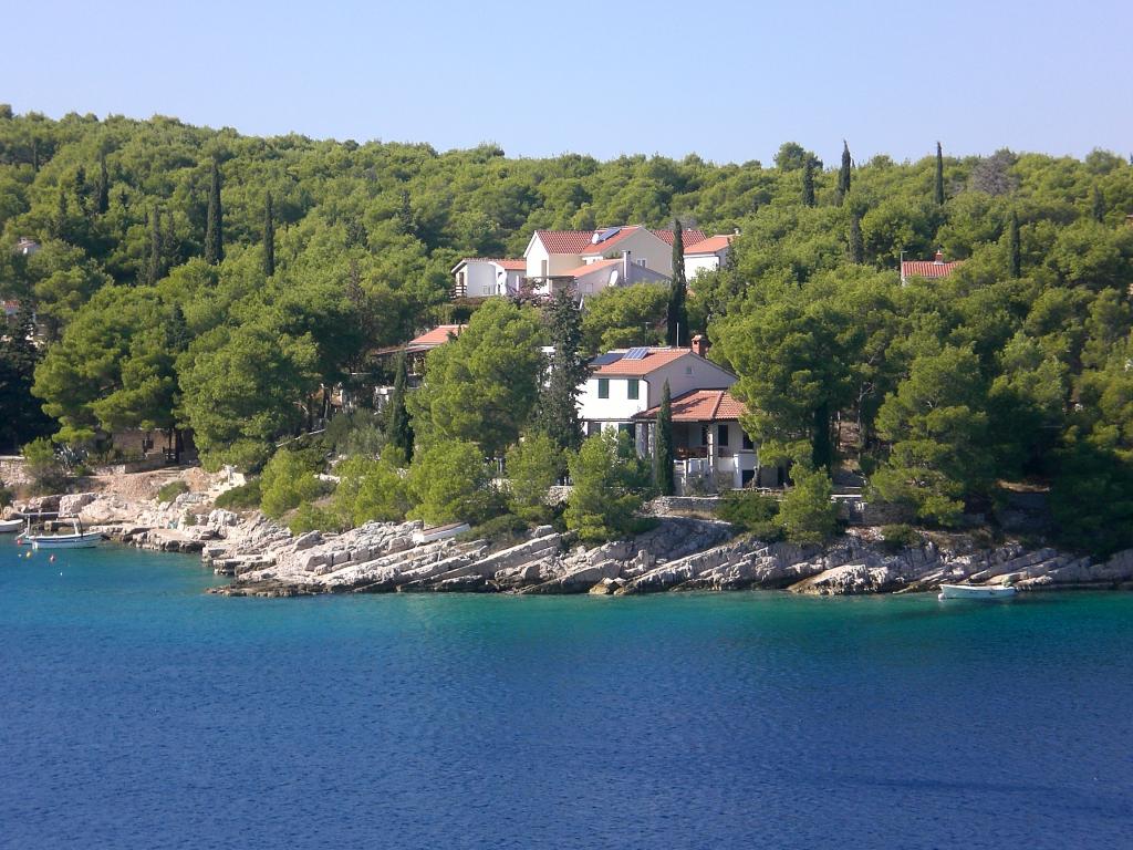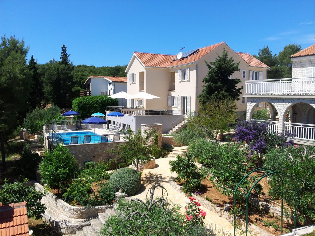 The detached holiday villa has a heated private pool and is located in the quiet and crystal-clear Osibova Bay, just 30 m from a small pebble beach. The house includes 4 kayaks and 8 bicycles. In the town of Milna, 2 km away, you'll find everything you need. On the way there, you'll find public sports fields (tennis, football, basketball and beach volleyball) that can be used. The modernly equipped villa consists of two identical residential units. In total, it features 6 bedrooms, 7 bathrooms, 2 living rooms with integrated kitchens, and a large shared sun terrace. In the basement, you'll find a 130 m² recreation room with games and fitness equipment, including billiards, table tennis and foosball. Facilities include Wi-Fi, private parking and a garden with a barbecue. The house is fully air-conditioned (each room with individually controllable air conditioning).
