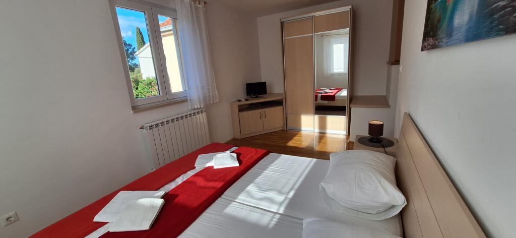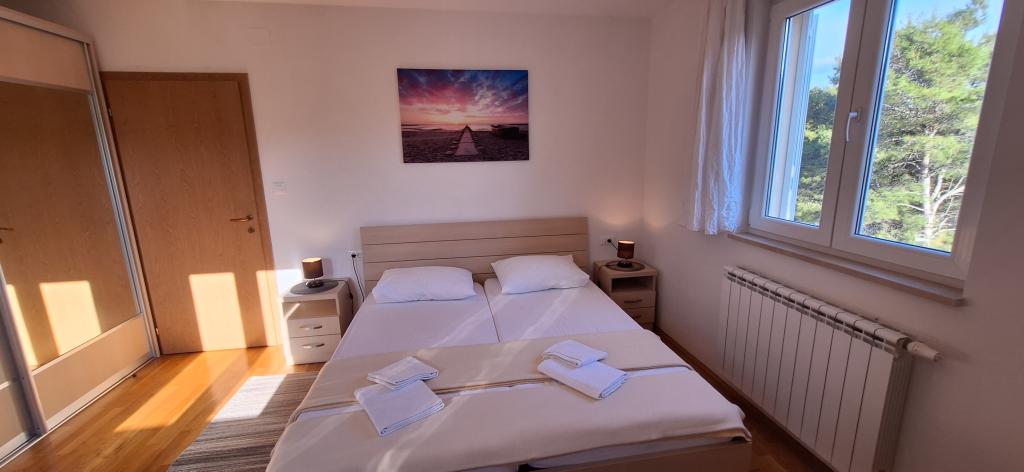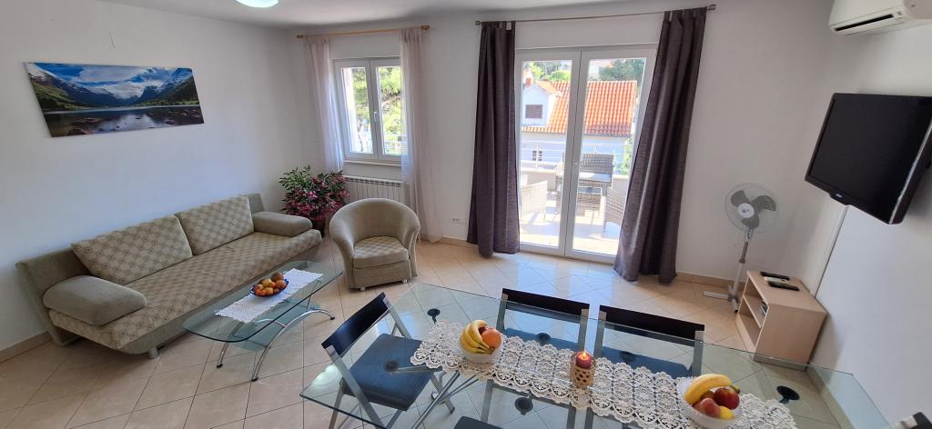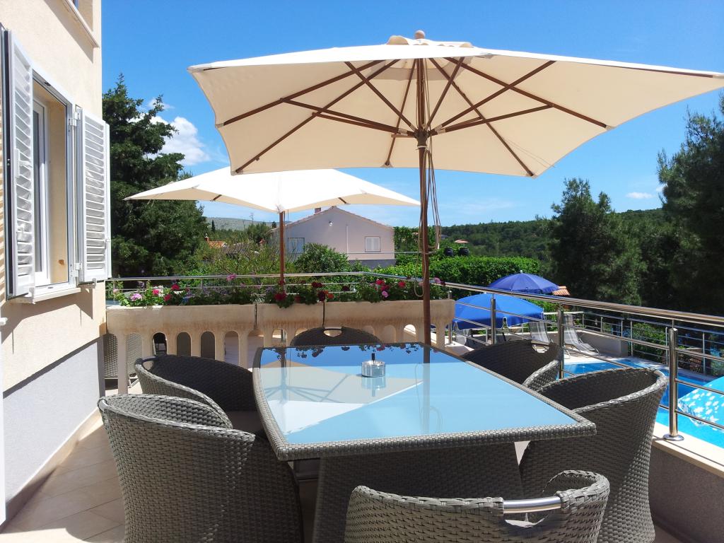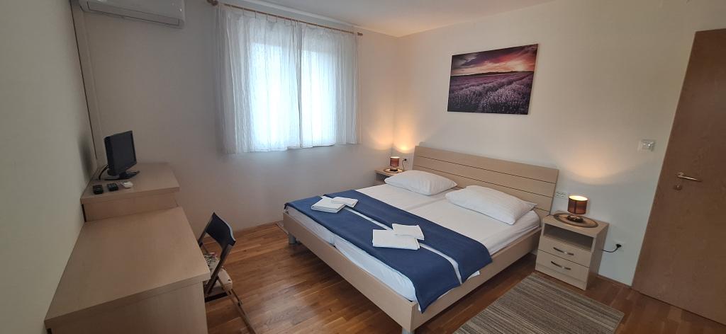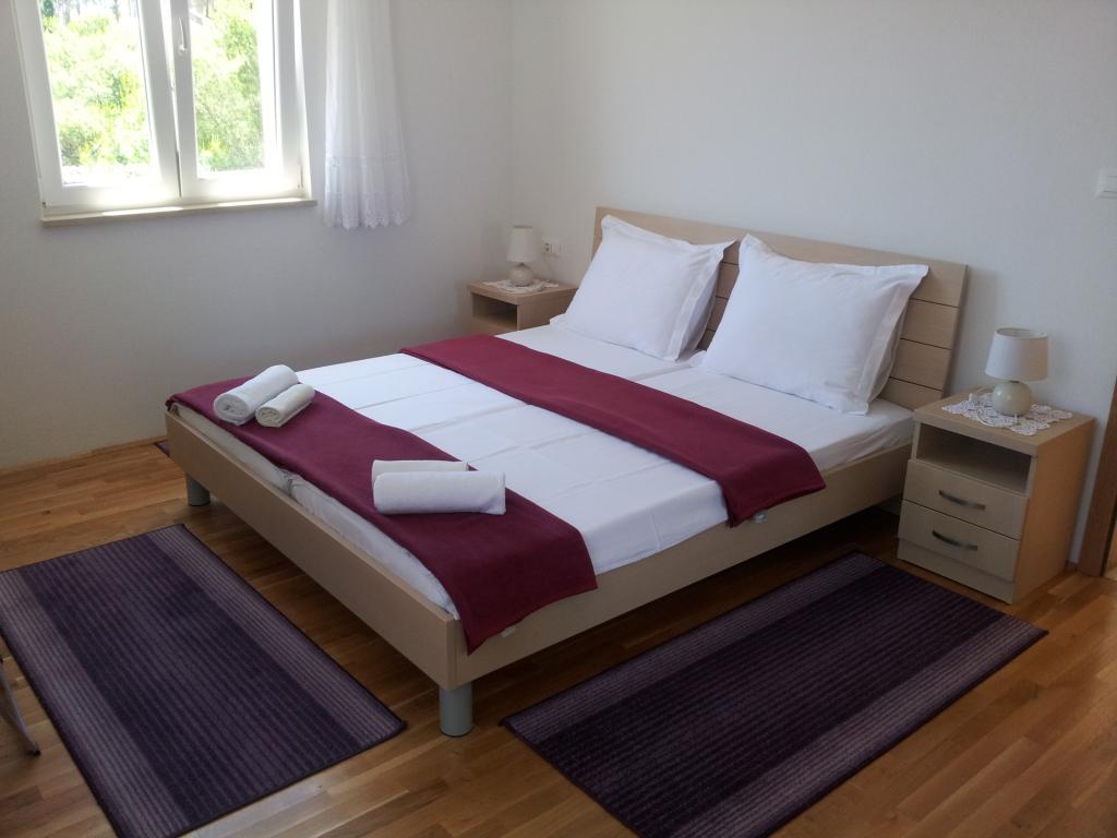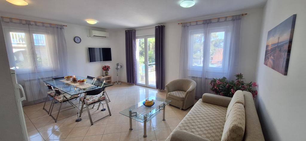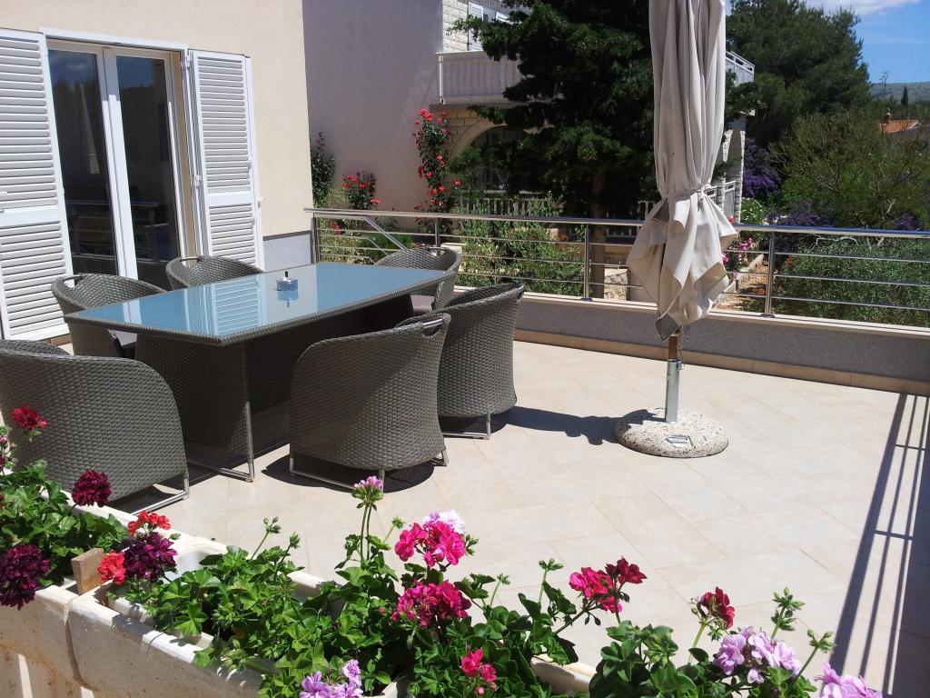 The detached holiday villa has a heated private pool and is located in the quiet and crystal-clear Osibova Bay, just 30 m from a small pebble beach. The house includes 4 kayaks and 8 bicycles. In the town of Milna, 2 km away, you'll find everything you need. On the way there, you'll find public sports fields (tennis, football, basketball and beach volleyball) that can be used. The modernly equipped villa consists of two identical residential units. In total, it features 6 bedrooms, 7 bathrooms, 2 living rooms with integrated kitchens, and a large shared sun terrace. In the basement, you'll find a 130 m² recreation room with games and fitness equipment, including billiards, table tennis and foosball. Facilities include Wi-Fi, private parking and a garden with a barbecue. The house is fully air-conditioned (each room with individually controllable air conditioning).