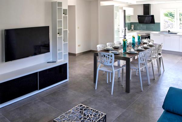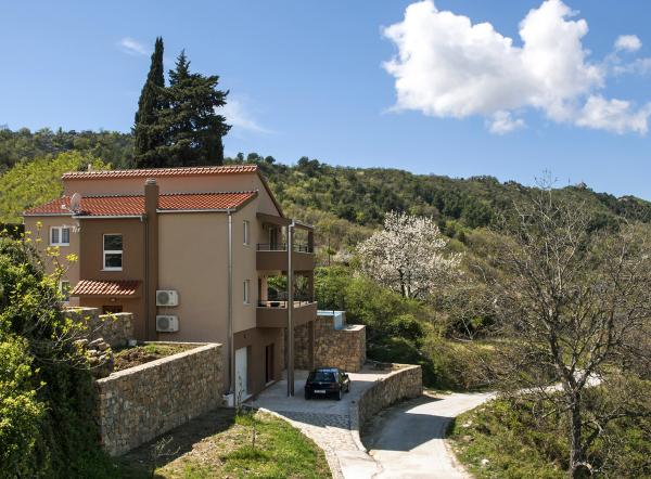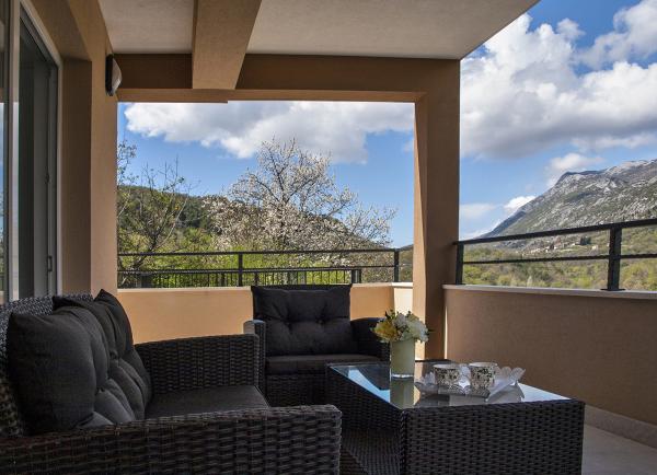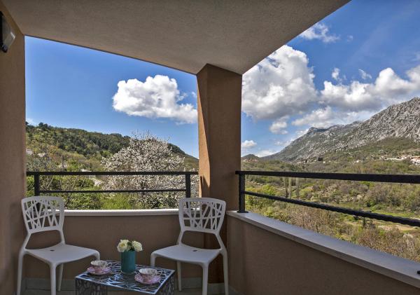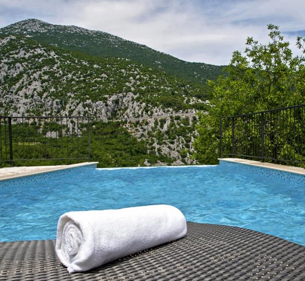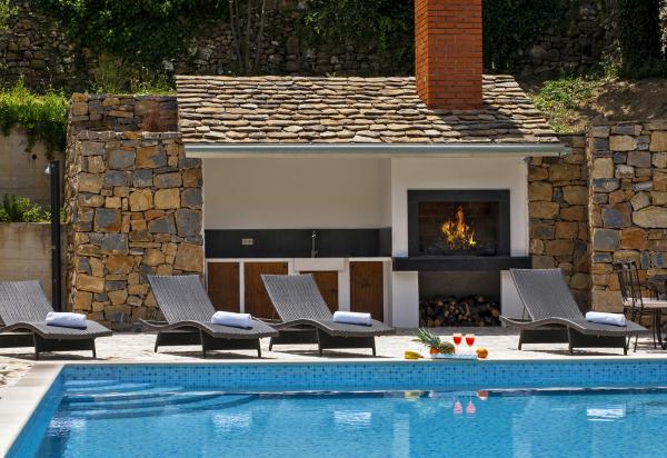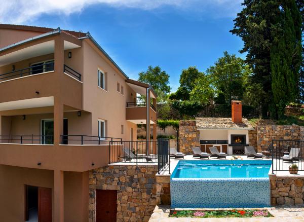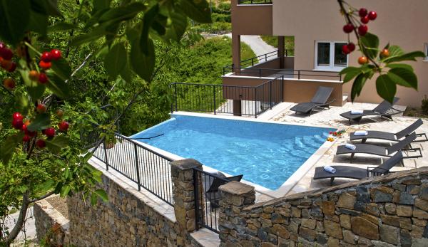 Moderně zařízený dům s přepadem bazénem, krytý lázeňský bazén a krásným výhledem na potok a hory. Nachází se v obci Smolonje v zázemí Omiše a 15 až 20 minut od centra města. Vila se skládá z pěti ložnic a pět koupelen a nabízí kompletní komfort pro 10 osob a má dvě děti. V přízemí se nachází garáž pro jedno auto, a místnost se stolním tenisem a WC. Dům má parkoviště pro dvě vozidla. V prvním patře dominuje obývací pokoj s komfortní kuchyní a jídelnou pro 12 osob, a obývací pokoj s LCD TV. Prostorná terasa se stolem a židlemi pro 4 osoby. Dvě ložnice a dvě koupelny. Ve druhém patře jsou tři ložnice a tři koupelny. Relaxační místnost s vířivkou pro 4 osoby, podlahové topení, sprchový kout a prostorný balkon. Všechny pokoje jsou plně klimatizovány. Vnější část velkého prostoru s grilem, stolem a židlemi, 6 židlí, přepadu bazénu 27m2.