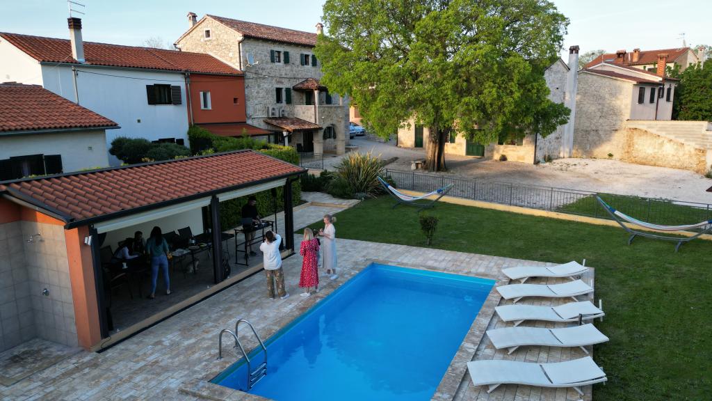 Antonci 18 je klasický istrijský statek sestávající ze 3 kamenných domů. Nemovitost má krásný dvůr se starým velkým stromem uprostřed. Čeká zde na vás romantická atmosféra. Klidná a idylická oáza odříznutá od okolního světa. Zde máte vše, abyste se cítili pohodlně, včetně vlastního bazénu, venkovní kuchyně a spousty prostoru pro děti a jejich čtyřnohé kamarády k odpočinku, opalování a hraní. Užijte si svůj pobyt v tomto jedinečném malém koutě světa a vraťte se znovu. Bazén 28 m2 - jen pro Vás Uprostřed dvora - stoletý dub. Užijete si její stín. Oplocená zahrada 1500 m2, 8 parkovacích míst pro vaše auta. Individuální klimatizace v každém pokoji. 8 ložnic, 6 koupelen, 3 obývací pokoje, 8 postelí, 2 rozkládací pohovky, 16 míst. hnusná aparatura pro ozvučení posilovna a projektor Vám pomůžeme se cateringem, fitness instruktory, maséry a organizací pro