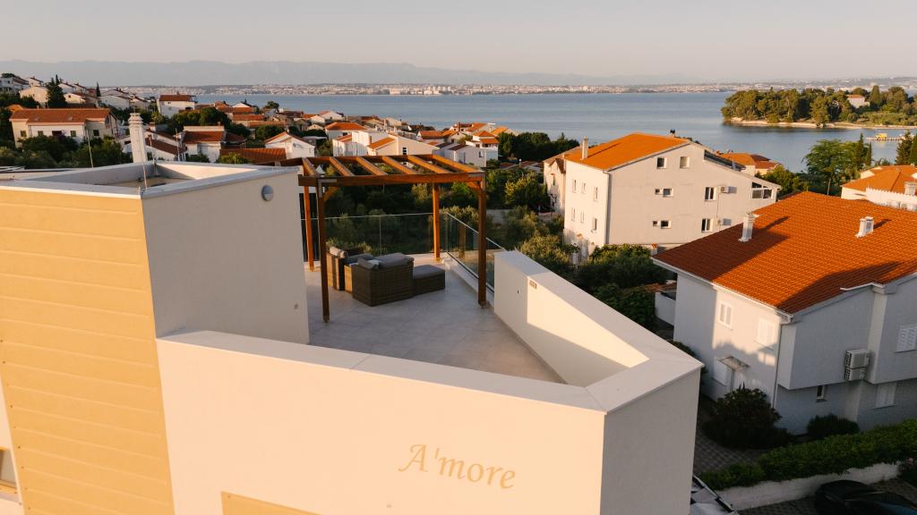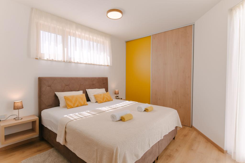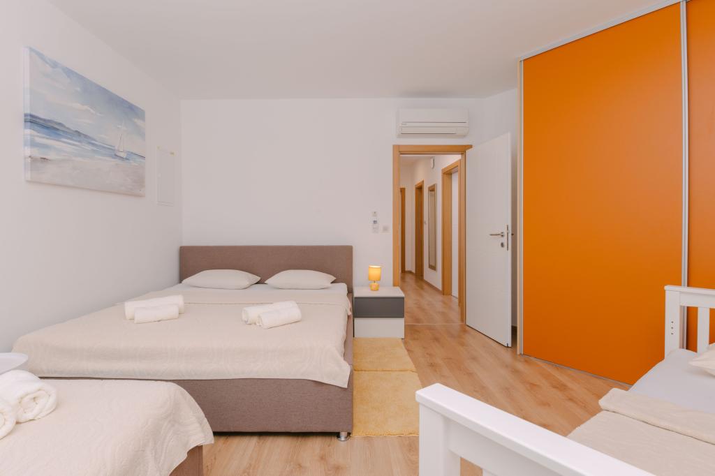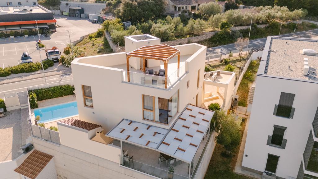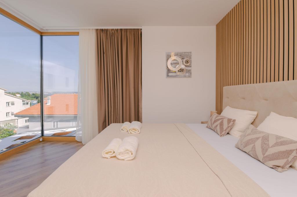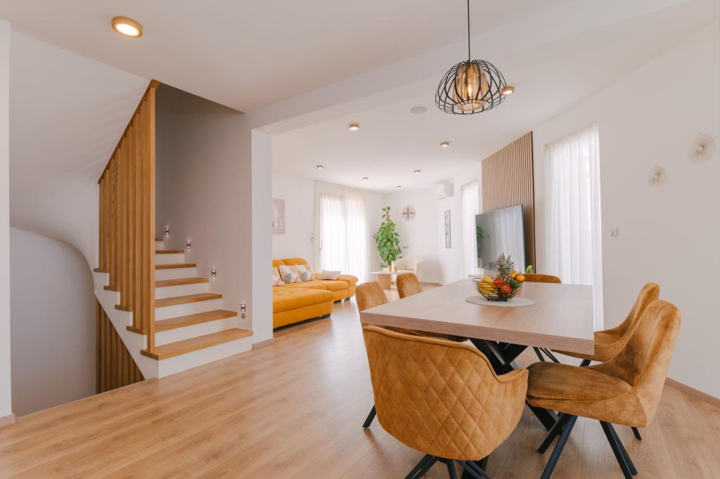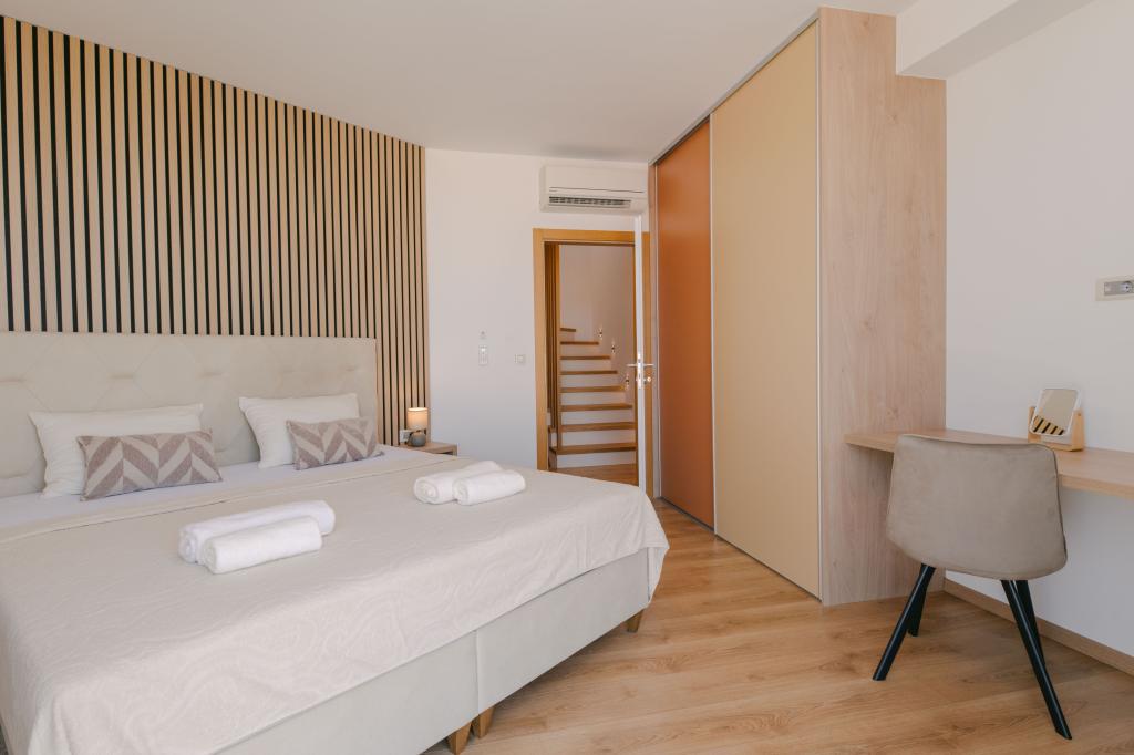 Tři moderní hlavní ložnice se nacházejí v patře, zatímco jeden pokoj pro hosty se nachází v suterénu. Všechny koupelny jsou vybaveny špičkovými armaturami Grohe a Laufen, prestižními designovými keramickými obklady a elegantními skleněnými dveřmi. Dům je oficiálně kategorizován Ministerstvem cestovního ruchu Chorvatské republiky, což umožňuje pohodlné ubytování pro 9, dokonce i 10 hostů. Otevřený obývací pokoj a jídelna, stejně jako každá ložnice, jsou vybaveny individuální klimatizací s tichým režimem, ideálním pro klidný spánek. Moderní kuchyně od slavné rakouské značky DanKüchen je plně vybavena špičkovými spotřebiči, včetně lednice s výrobníkem ledu a dávkovače studené vody.