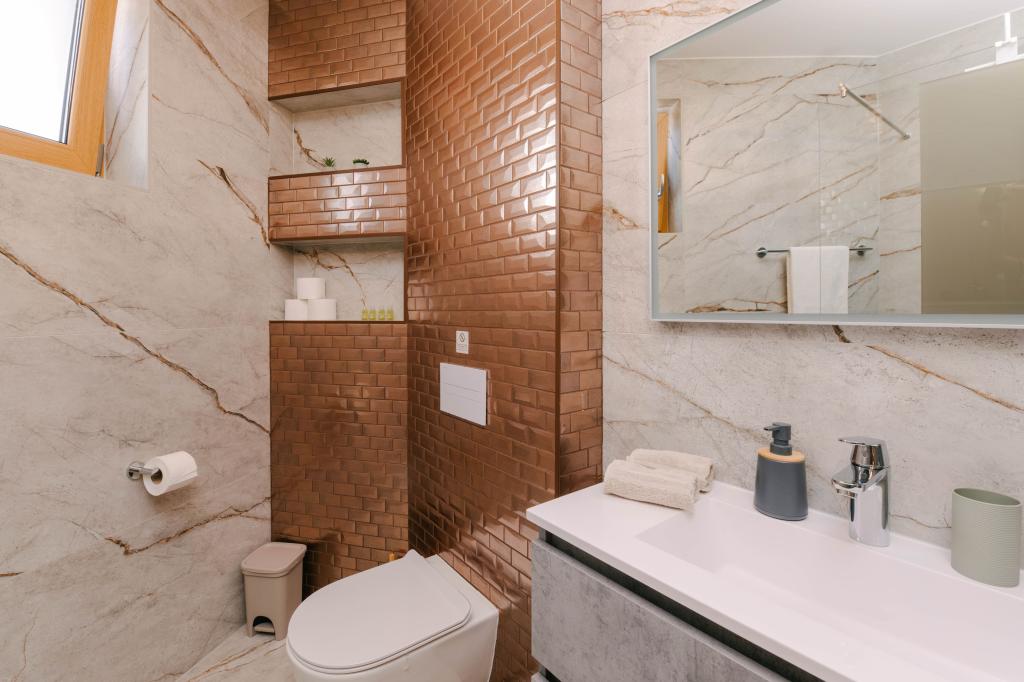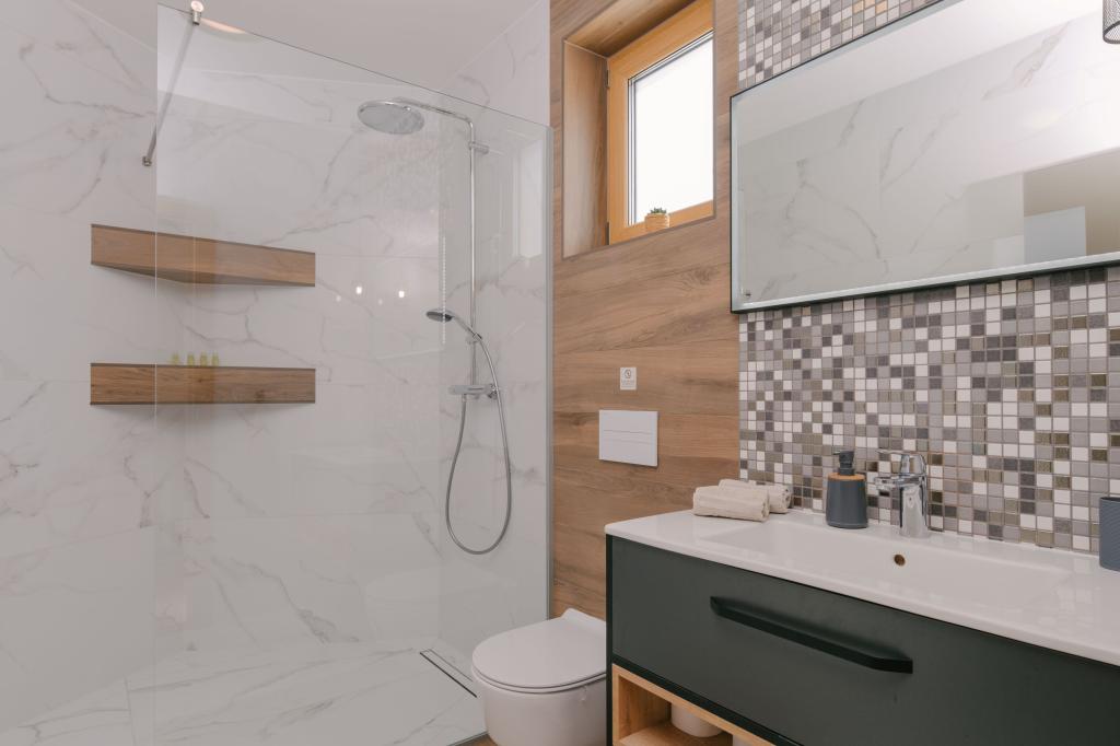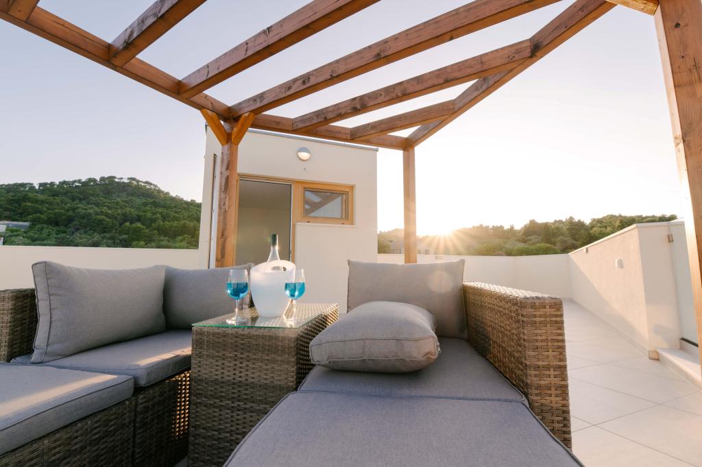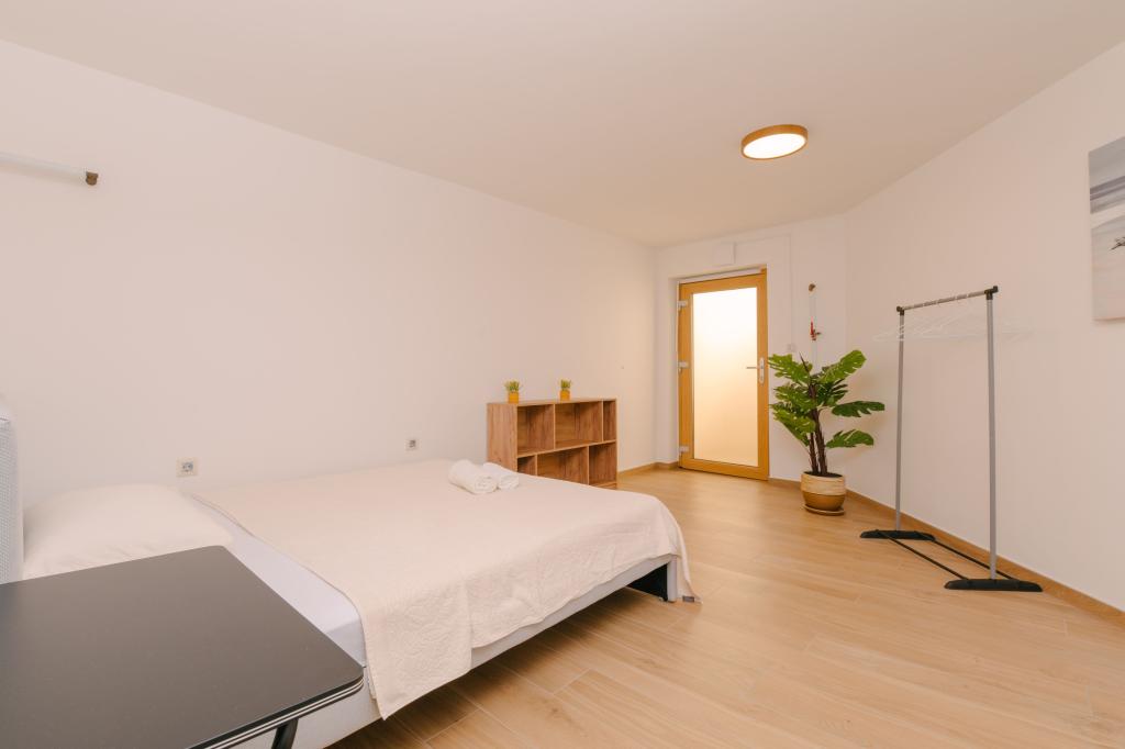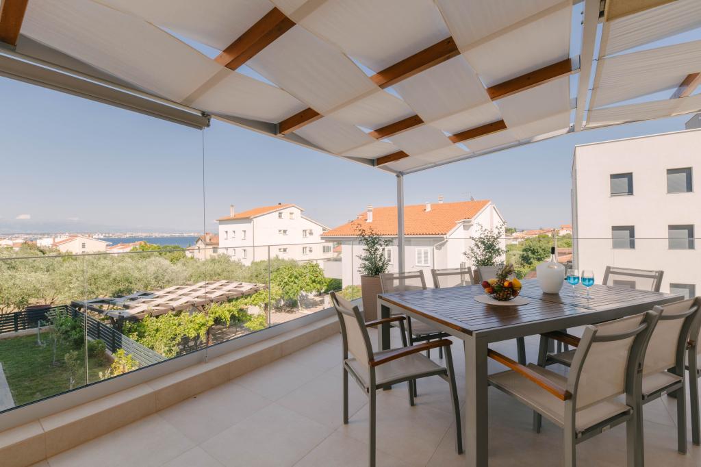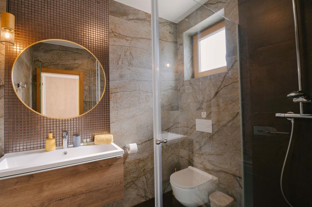 Tři moderní hlavní ložnice se nacházejí v patře, zatímco jeden pokoj pro hosty se nachází v suterénu. Všechny koupelny jsou vybaveny špičkovými armaturami Grohe a Laufen, prestižními designovými keramickými obklady a elegantními skleněnými dveřmi. Dům je oficiálně kategorizován Ministerstvem cestovního ruchu Chorvatské republiky, což umožňuje pohodlné ubytování pro 9, dokonce i 10 hostů. Otevřený obývací pokoj a jídelna, stejně jako každá ložnice, jsou vybaveny individuální klimatizací s tichým režimem, ideálním pro klidný spánek. Moderní kuchyně od slavné rakouské značky DanKüchen je plně vybavena špičkovými spotřebiči, včetně lednice s výrobníkem ledu a dávkovače studené vody.