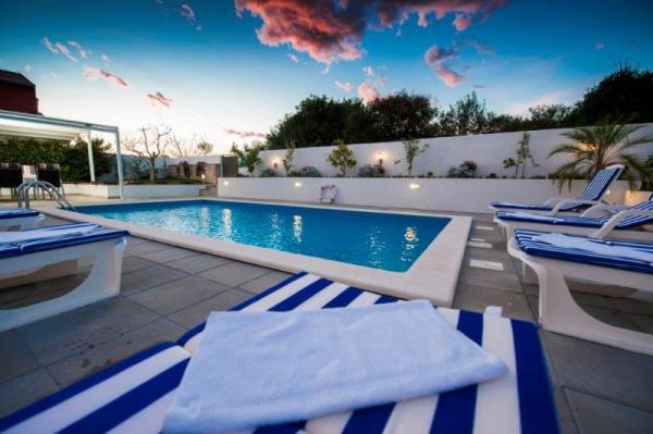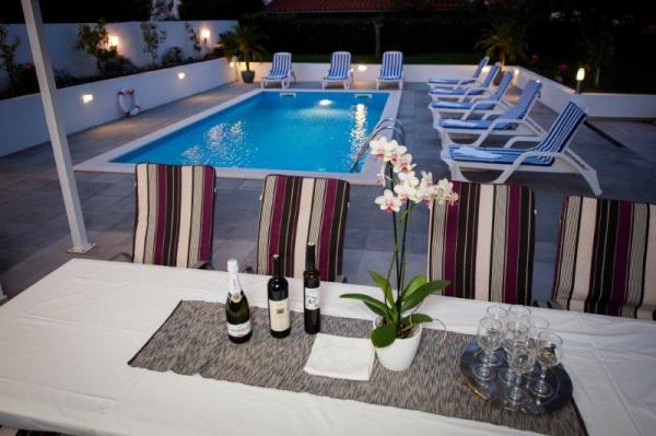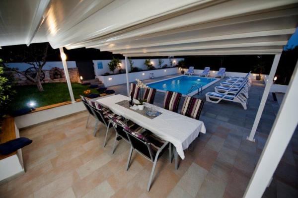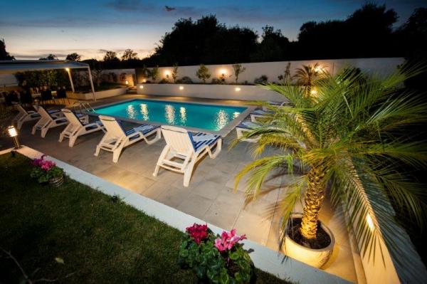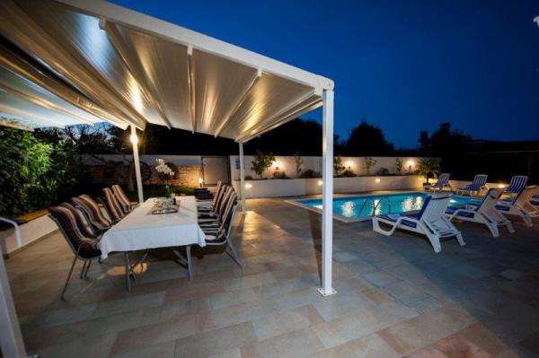 Tento moderní a plně vybavená vila s bazénem, dvojdomku, který se nachází v klidném předměstí města Rovinj, který se nachází pouhých 2000 m od centra města a pláže. Zařízen moderním, stylovým nábytkem, a komunikace mezi kuchyní a prostorným obývacím pokojem a velkou krytou terasu 24m byl otevřen. V domě se nachází celkem 4 ložnice, velký obývací pokoj, velký, moderní kuchyně, 2 x koupelna / WC, 1 x koupelna, předsíň, satelitní TV, internet / Wi-Fi, 2 x klimatizace, velká krytá terasa, která je vybavena zahradní nábytek. Za domem je bazén 24 m2. Pro úplnou relaxaci, které můžete využít gril, baldachýn, stůl a židle pro jídelny a lehátky.