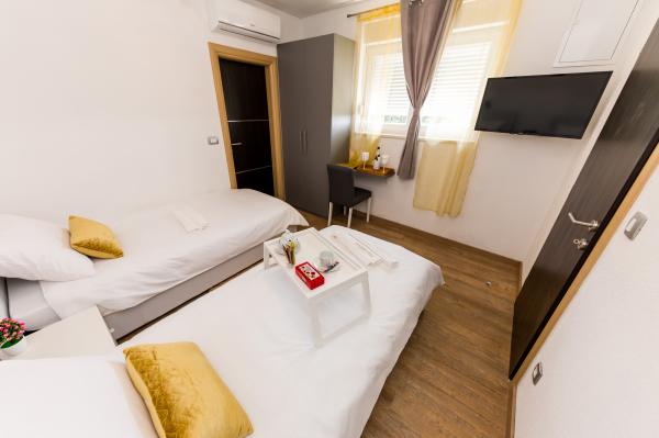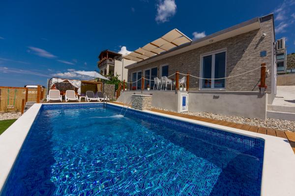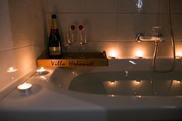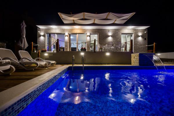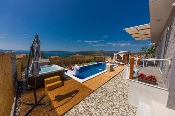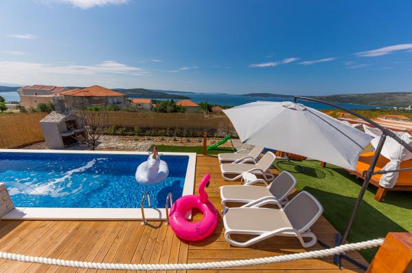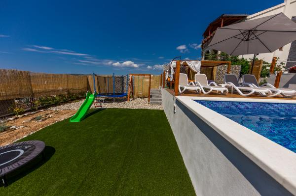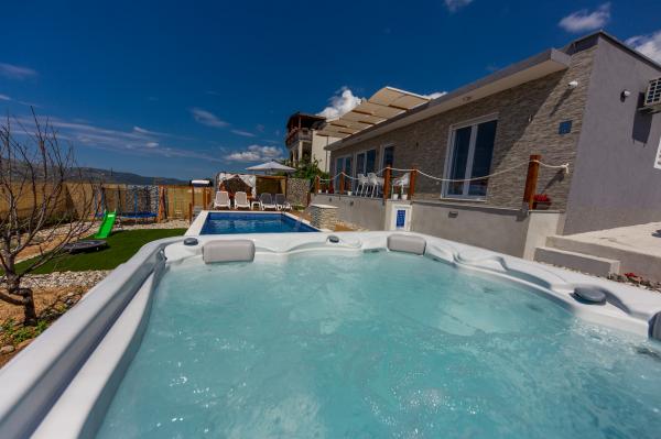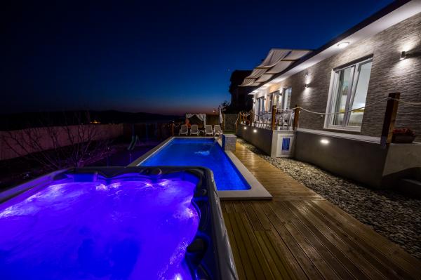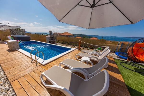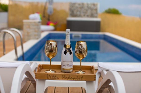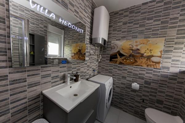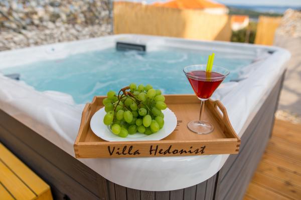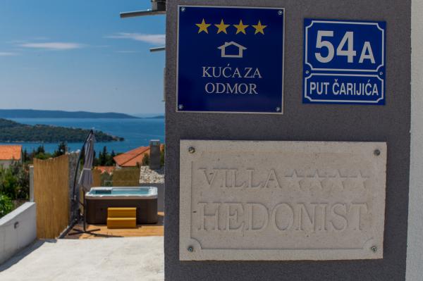 VILLA HEDONIST se nachází v obci Seget Vranjica 3 km od Trogir. Má 5 koupelen, 4 pokoje, finskou saunu, posilovnu, obývací pokoj, kuchyň a jídelnu. Každý pokoj má vlastní koupelnu a satelitní TV, klimatizaci, trezor, šatní skříň ... před domem je bazén o rozloze 28m2 se 6 šatníky a dřevěnou postelí s přeplněním. Vířivá vana u bazénu pro 5 osob. V zahradě je umělá tráva s dětským hřištěm, trampolínou, houpačkami, skluzavkami a grilem. Za domem je parkoviště pro 3 auta.