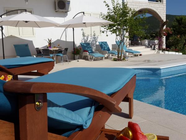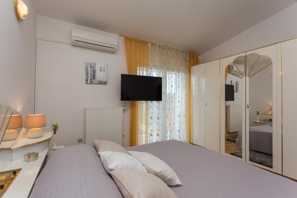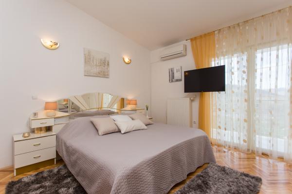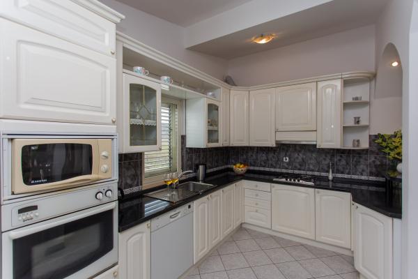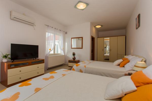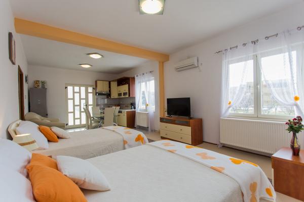 Pobytová taxa je v ceně.pokoje První patro Vila má 4 ložnice v 1. patře (3 ložnice s 1 manželskou postelí a 1 ložnice se 2 samostatnými postelemi). Dvoulůžkový pokoj s manželskou postelí je vybaven klimatizací a trezorem na stěnu. V hlavní koupelně najdete vířivku, bidet, levandule a toaletu a vysoušeč vlasů. Plně vybavená velká kuchyň s lednicí a mrazničkou, pračka a vše, co potřebujete k vaření a stolování, je zde pro vás k použití. Obývací pokoj s pohovkou, LCD TV se satelitním příjmem, klimatizací a terasou v přední části domu Přízemí V přízemí se nachází studio se dvěma velkými manželskými postelemi, rozkládací pohovkou pro dvě osoby, plně vybavenou kuchyní a koupelnou.