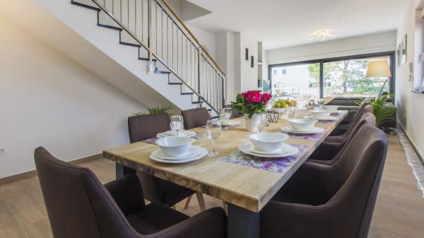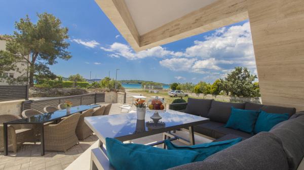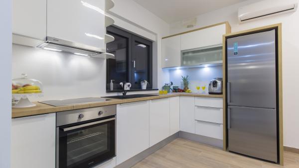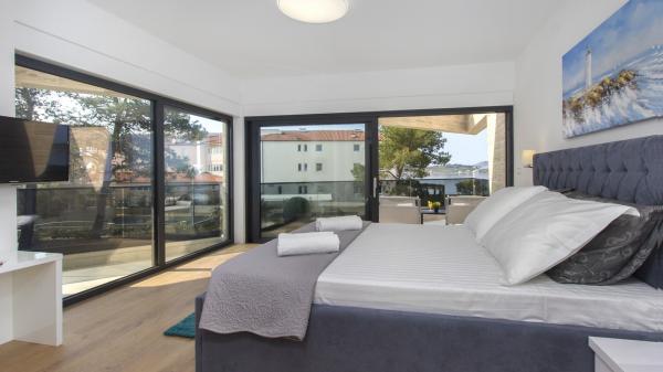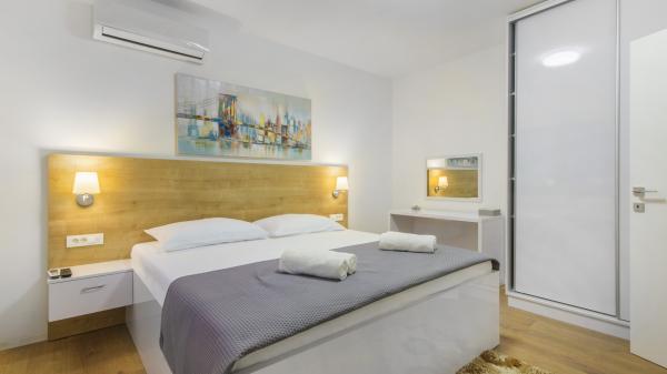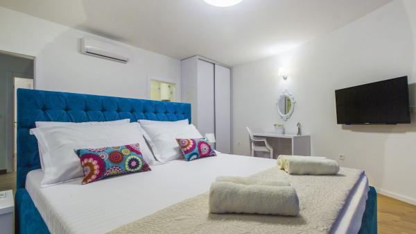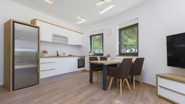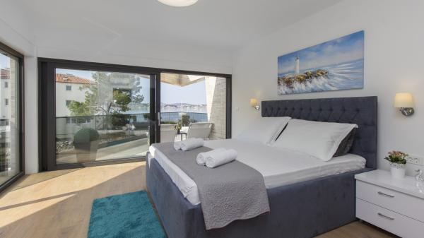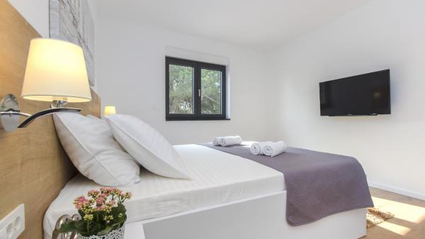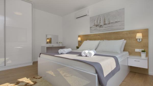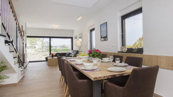Villa Okit je nově postavená a moderní vila, která se nachází jen 50 metrů od písečné pláže v obci Srima, 3 km od Vodic, 13 km od Šibeniku. V přízemí je kuchyň, obývací pokoj a obývací pokoj, který tvoří jeden celek a samostatná koupelna, z obývacího pokoje je terasa a upravený dvůr se zahradním nábytkem a prostorem na opalování. Kuchyň je plně vybavena potřebným nádobím a kuchyňským koutem pro přípravu jídel a nápojů. V přízemí se nachází také samostatný apartmán s jednou ložnicí, koupelnou, kuchyní a jídelnou, kde můžete vystoupit z dvora. V 1. patře domu jsou 4 ložnice a 3 koupelny. Ložnice 1, 20m2 s vlastní koupelnou a výstupem na balkon, 180X200 lůžko, TV. Ložnice 2, 25m2, s vlastní koupelnou a výstupem na balkon, 180X200 lůžko, TV. Ložnice 3 a Ložnice 4 mají společnou koupelnu, z nichž každá má 15 m2, každá má 180x200 lůžek, komodu a TV. Oplocený dvůr s prostorem na opalování a zahradním nábytkem, parkovací místo.
