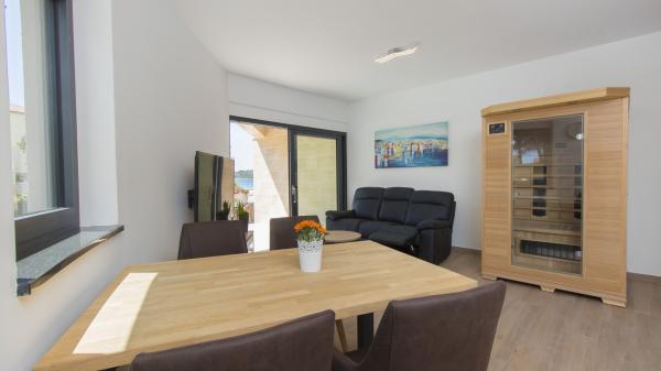 V ceně ubytování, daň, ložní prádlo, parkoviště, klimatizace, internet, welcome drink, sauna, vířivka. Možnost pronájmu, e-koloběžky, motorového člunu, masáže .....