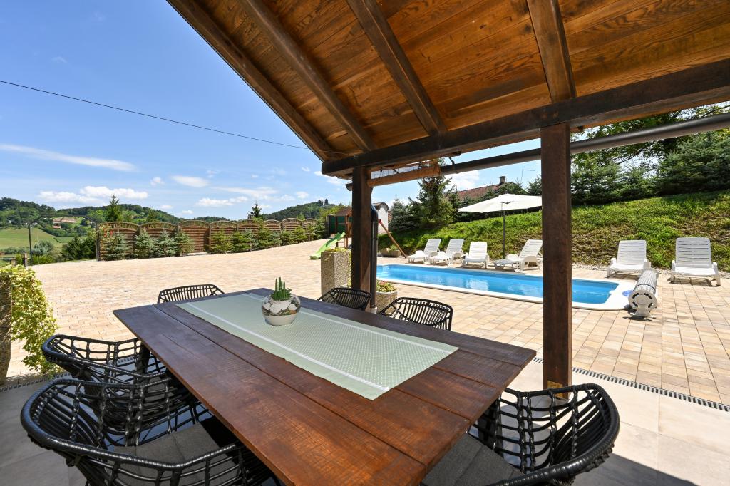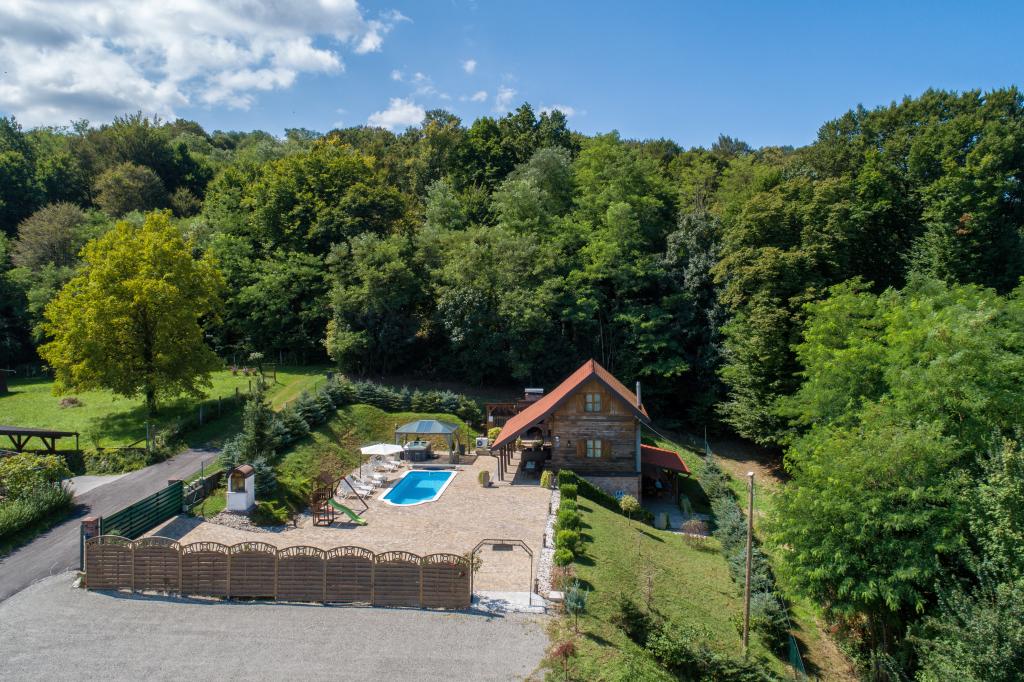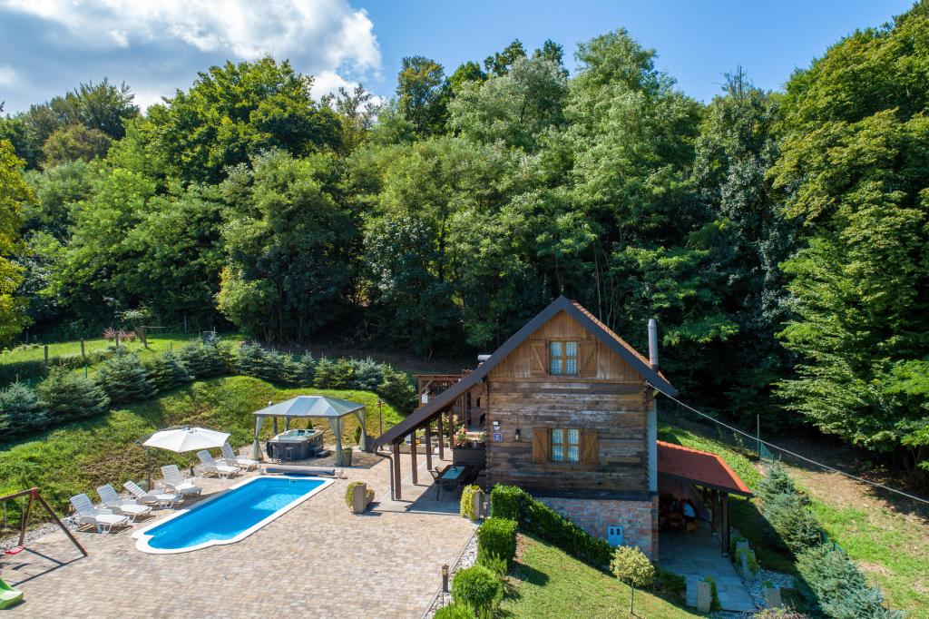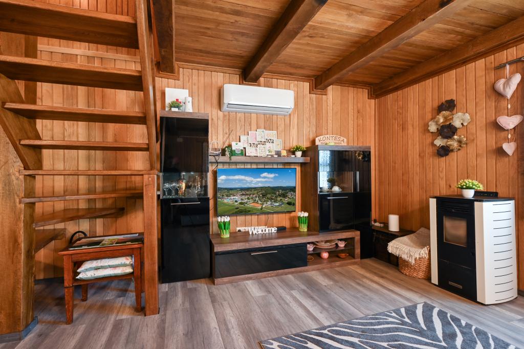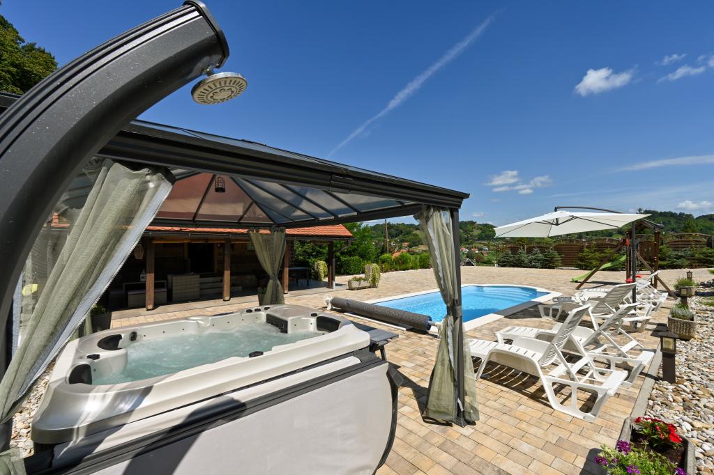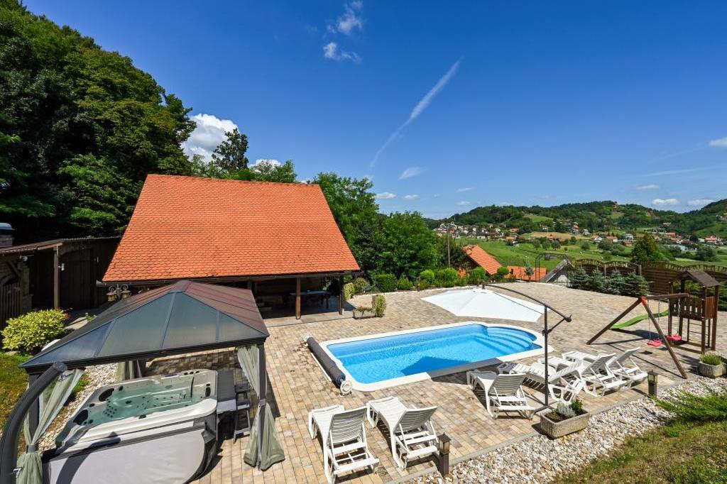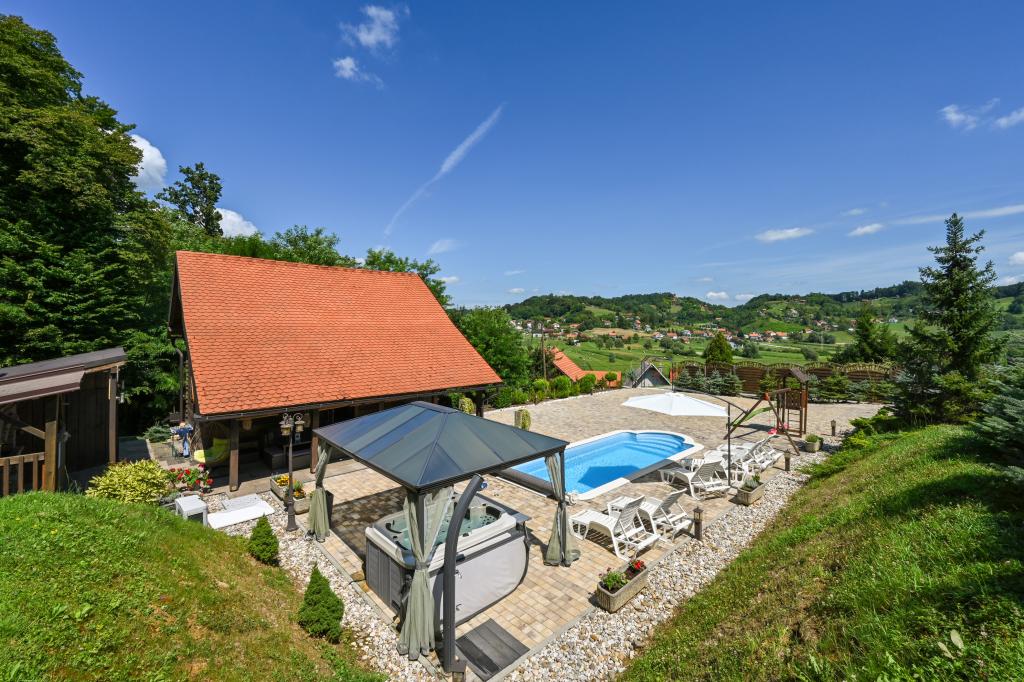Pokud byste si měli představit dovolenou v pravém slova smyslu, která se nachází na samém vrcholu kopce, pak tou správnou destinací, ale zároveň útočištěm před hektickým životním stylem, by byl prázdninový dům Kontesa. Zde můžete úplně všechno nechat za sebou, věnovat se těm, kteří vás dělají šťastnými, a užívat si výhod, které nabízí čistá příroda a poklidný region Zagorje. Protože jediné, co uslyšíte, bude zpěv ptáků a vítr procházející korunami stromů, přičemž váš pohled bude sahat na okolní kopce, které mění svou barevnou paletu podle ročního období. Budete zastaveni v čase a budete mít příležitost znovu se spojit s rodinou, při ranním posezení na prostorné terase u kávy nebo při čekání na západ slunce a večerním pozorování hvězd. V objetí přírody uvolněte své tělo ve vyhřívaném bazénu nebo vířivce. Spojte se se svými dětmi nebo přáteli a společně grilujte, hrajte stolní hry nebo ty, které jsou k dispozici doma, existuje mnoho možností. A dům, vyrobený z