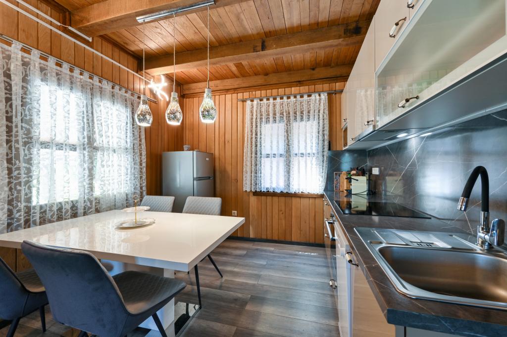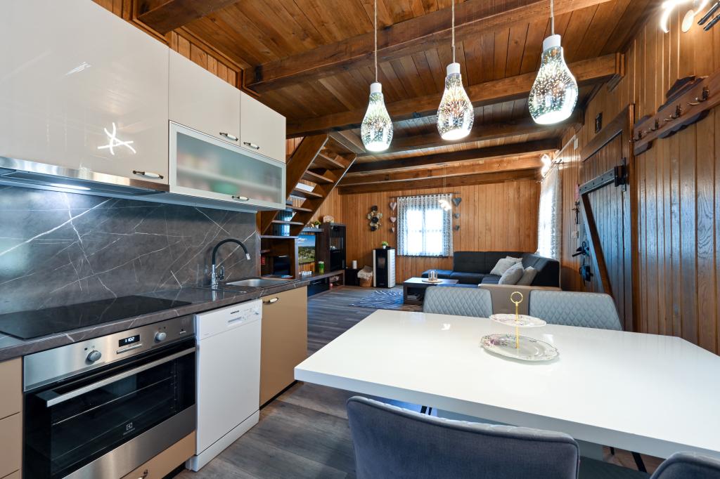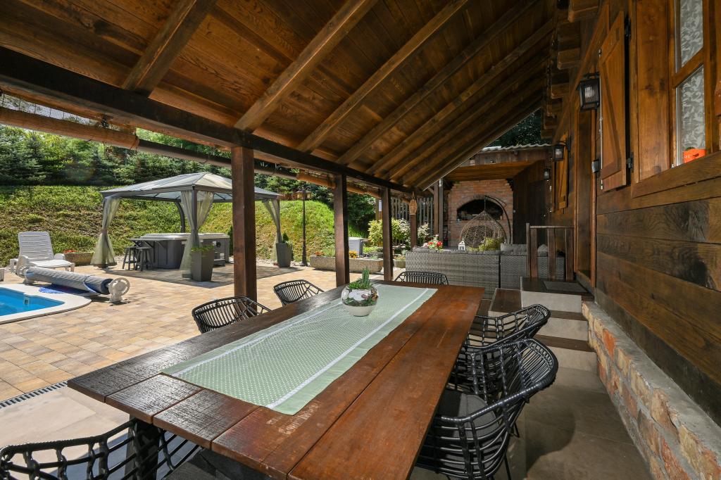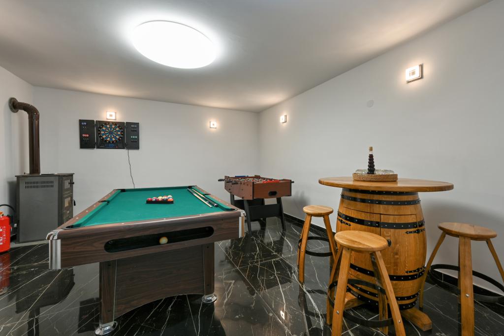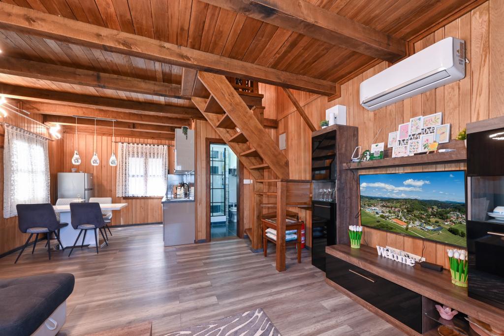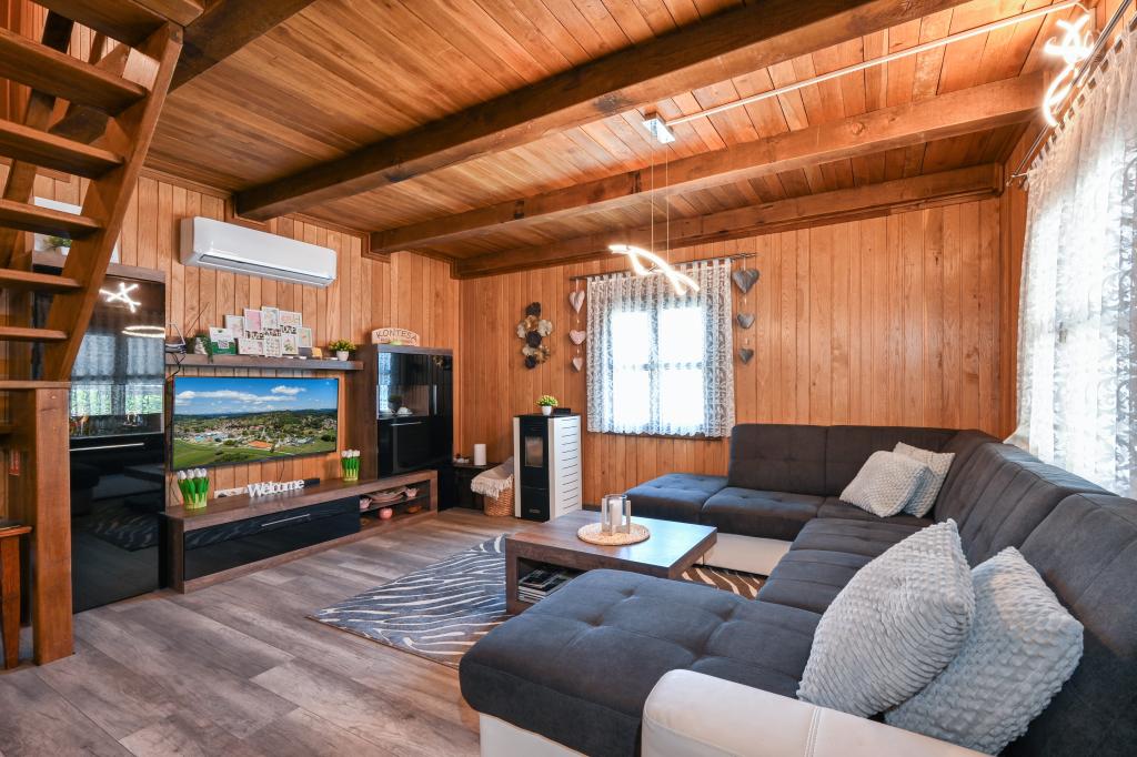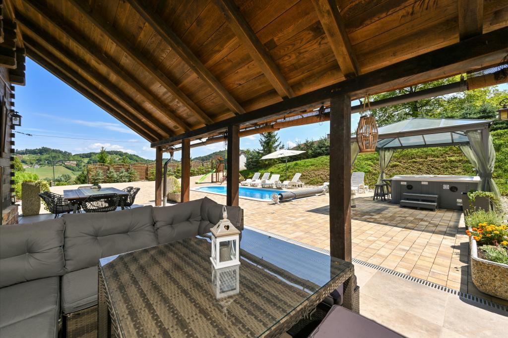 Pokud byste si měli představit dovolenou v pravém slova smyslu, která se nachází na samém vrcholu kopce, pak tou správnou destinací, ale zároveň útočištěm před hektickým životním stylem, by byl prázdninový dům Kontesa. Zde můžete úplně všechno nechat za sebou, věnovat se těm, kteří vás dělají šťastnými, a užívat si výhod, které nabízí čistá příroda a poklidný region Zagorje. Protože jediné, co uslyšíte, bude zpěv ptáků a vítr procházející korunami stromů, přičemž váš pohled bude sahat na okolní kopce, které mění svou barevnou paletu podle ročního období. Budete zastaveni v čase a budete mít příležitost znovu se spojit s rodinou, při ranním posezení na prostorné terase u kávy nebo při čekání na západ slunce a večerním pozorování hvězd. V objetí přírody uvolněte své tělo ve vyhřívaném bazénu nebo vířivce. Spojte se se svými dětmi nebo přáteli a společně grilujte, hrajte stolní hry nebo ty, které jsou k dispozici doma, existuje mnoho možností. A dům, vyrobený z
