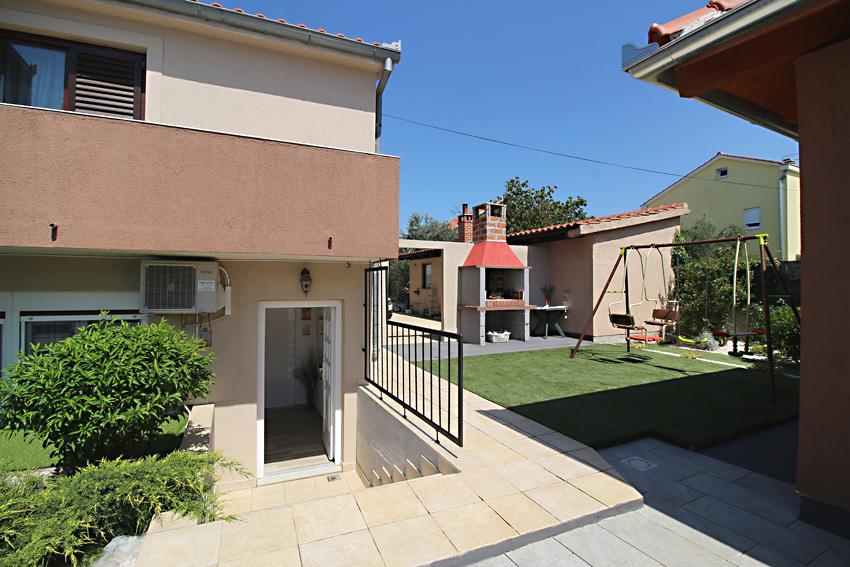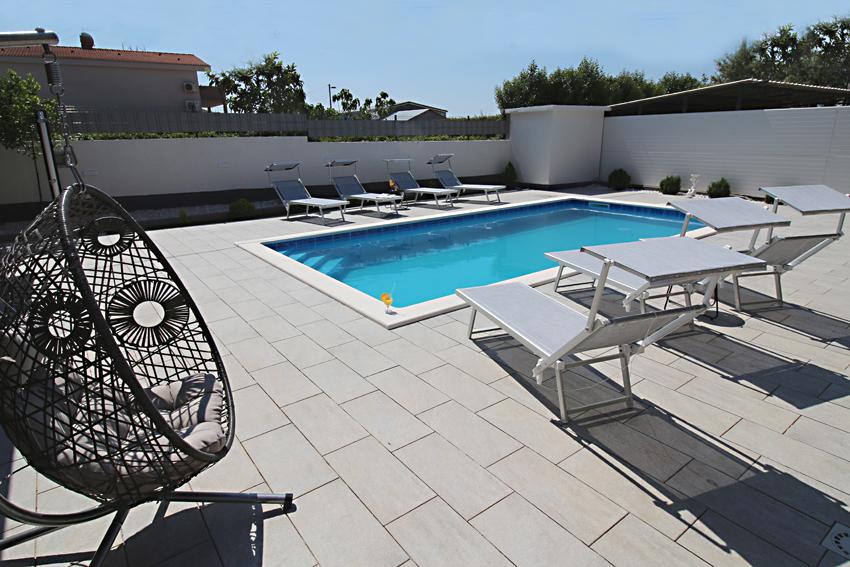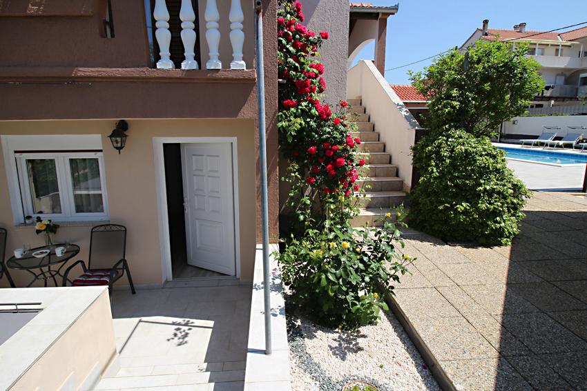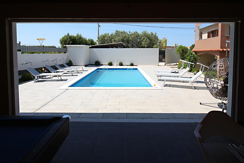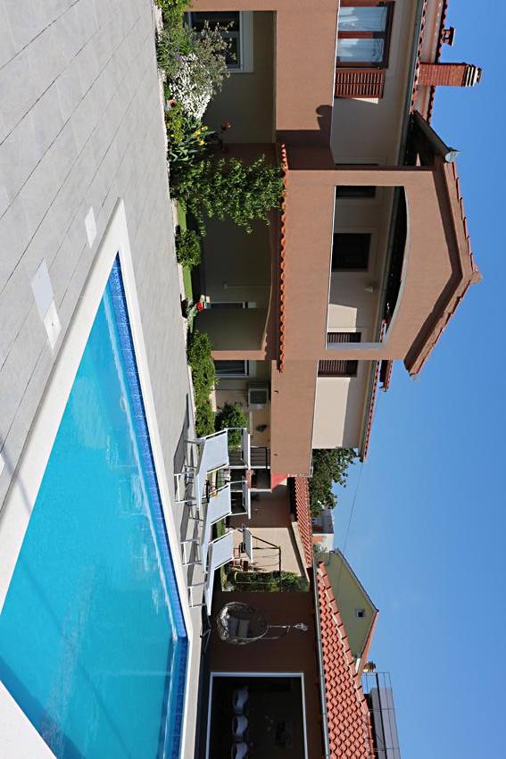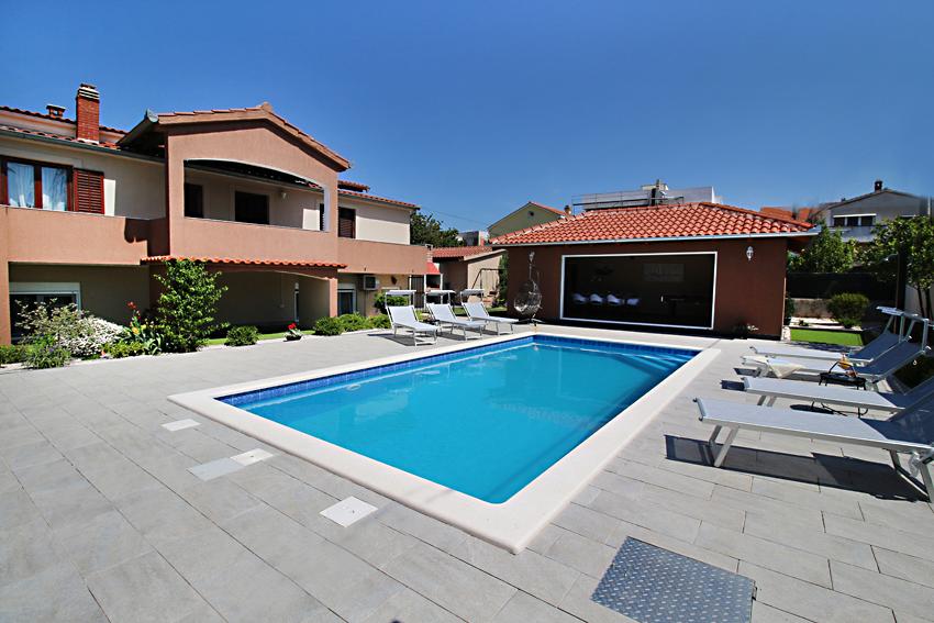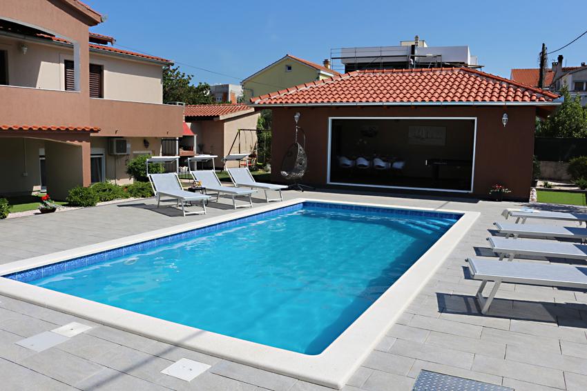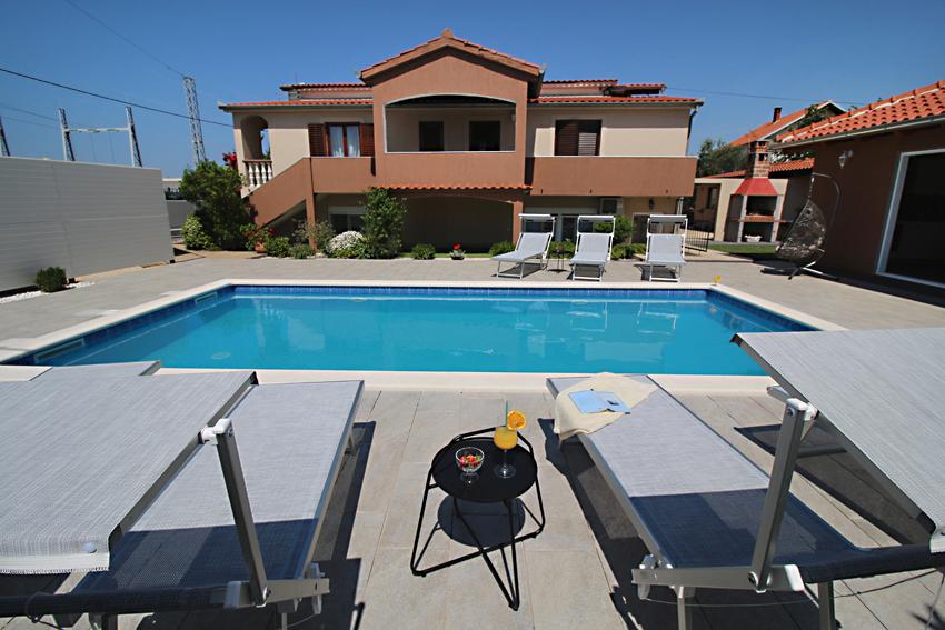 Villa Anda se nachází v Zadaru, 3 km od centra města. Skládá se ze 3 apartmánů, které jsou určeny pro stejnou skupinu hostů, což znamená, že v budově nebudou kromě vás žádní další hosté. Apartmán v patře se skládá ze 2 ložnic, jedna s manželskou postelí a druhá s jednolůžkem. Apartmán má také TV, klimatizaci, koupelnu a kuchyň se všemi potřebnými příbory.V přízemí jsou 2 studiové apartmány stejné velikosti a každý má TV, klimatizaci, manželskou postel pro 2 osoby, vlastní koupelnu a kuchyň s veškeré potřebné nádobí. Na dvoře je bazén 8x4 metry a před ním je místnost s plně vybavenou letní kuchyní a WC kde je společná pračka.Vedle gril a houpačky pro děti.Hosté mají 3 krytá parkovací stání.