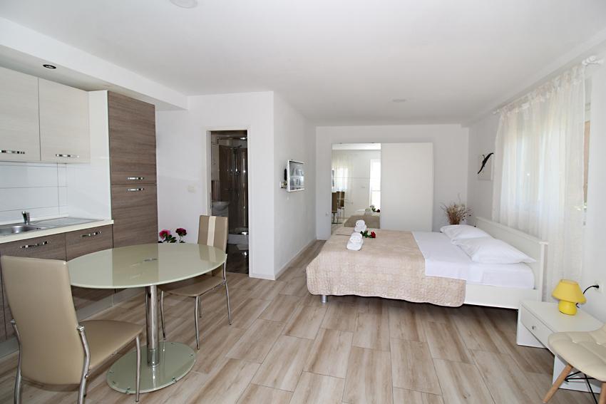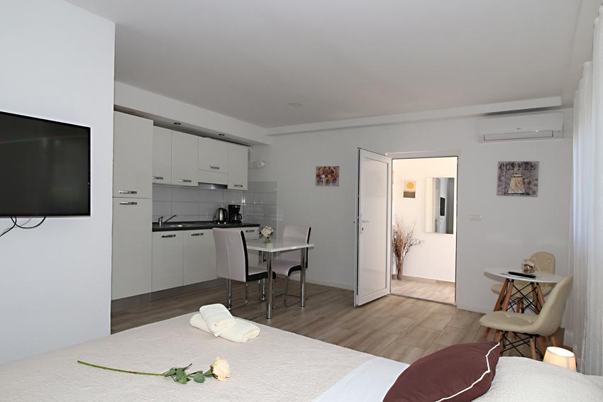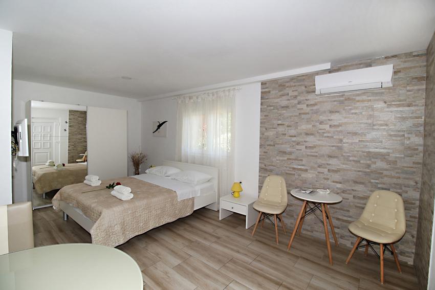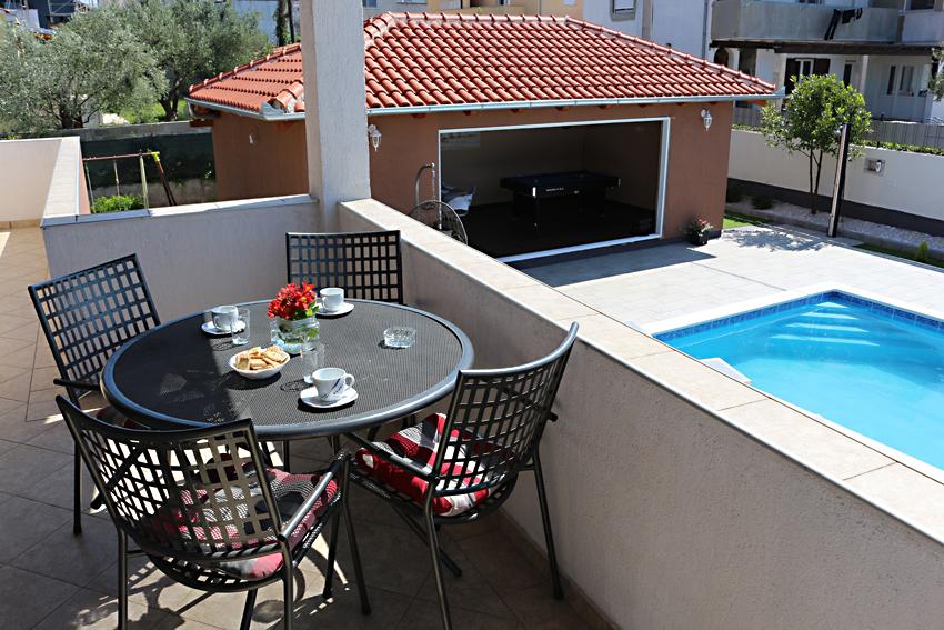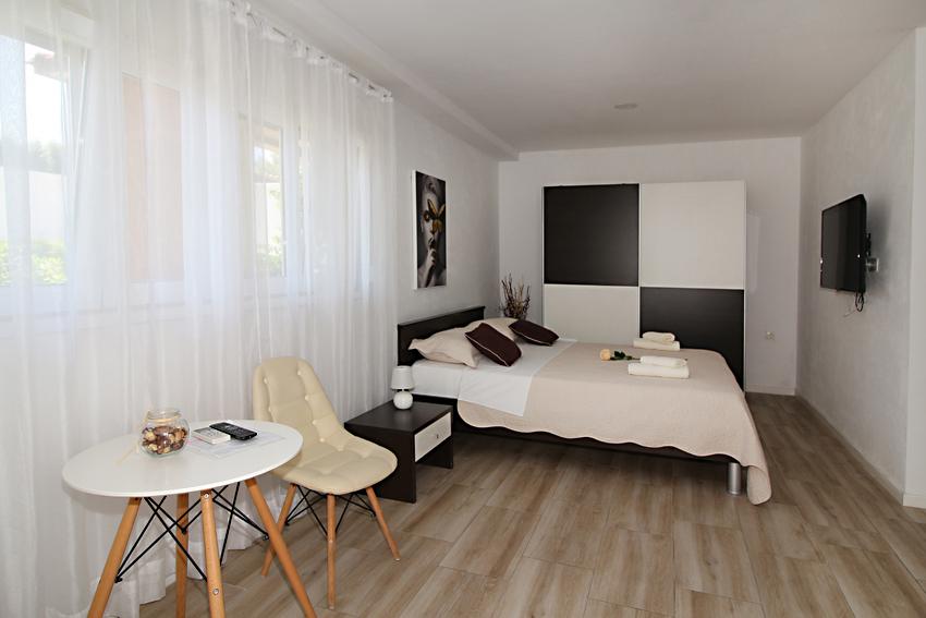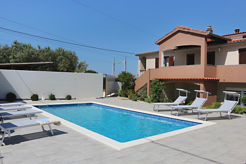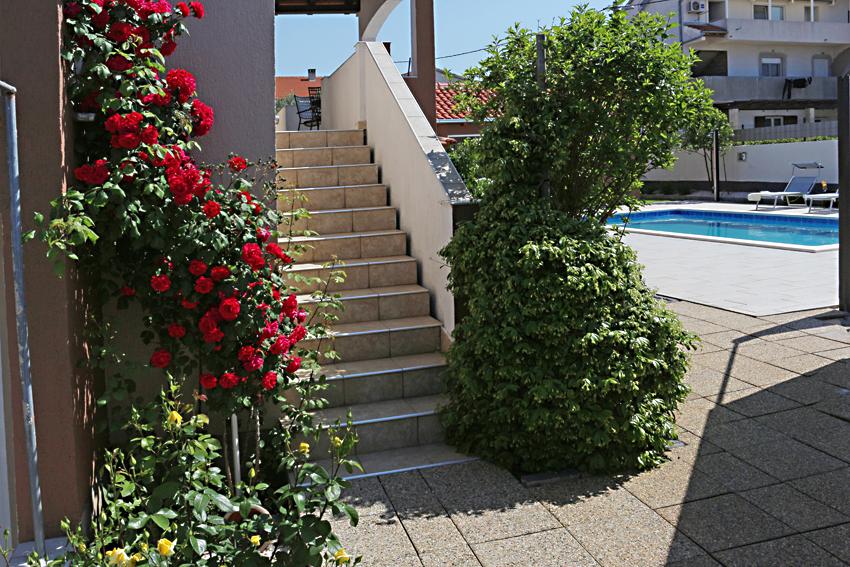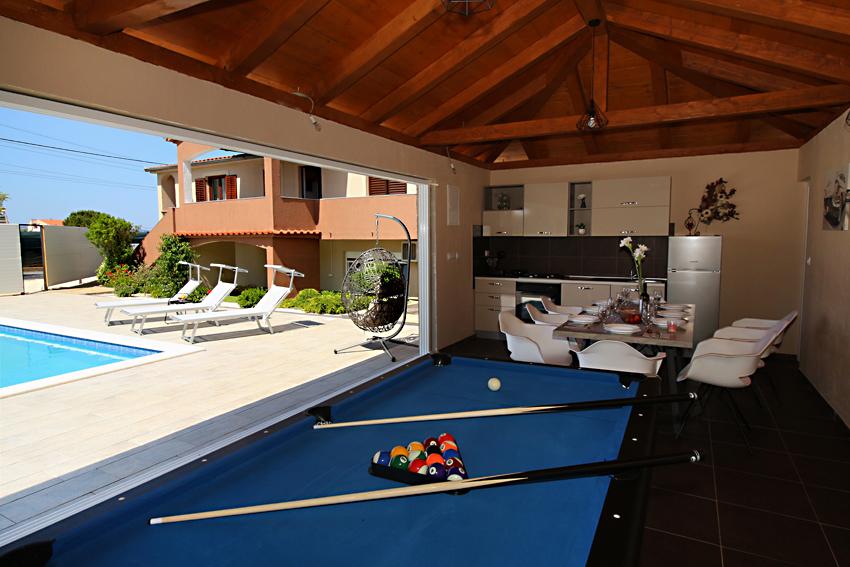 Villa Anda se nachází v Zadaru, 3 km od centra města. Skládá se ze 3 apartmánů, které jsou určeny pro stejnou skupinu hostů, což znamená, že v budově nebudou kromě vás žádní další hosté. Apartmán v patře se skládá ze 2 ložnic, jedna s manželskou postelí a druhá s jednolůžkem. Apartmán má také TV, klimatizaci, koupelnu a kuchyň se všemi potřebnými příbory.V přízemí jsou 2 studiové apartmány stejné velikosti a každý má TV, klimatizaci, manželskou postel pro 2 osoby, vlastní koupelnu a kuchyň s veškeré potřebné nádobí. Na dvoře je bazén 8x4 metry a před ním je místnost s plně vybavenou letní kuchyní a WC kde je společná pračka.Vedle gril a houpačky pro děti.Hosté mají 3 krytá parkovací stání.